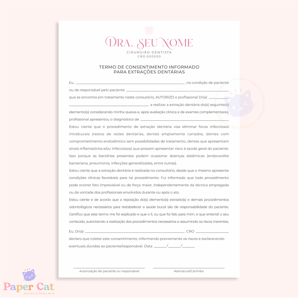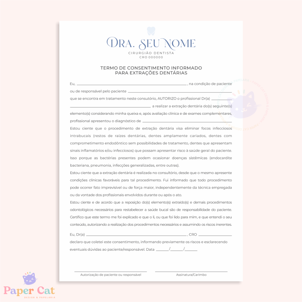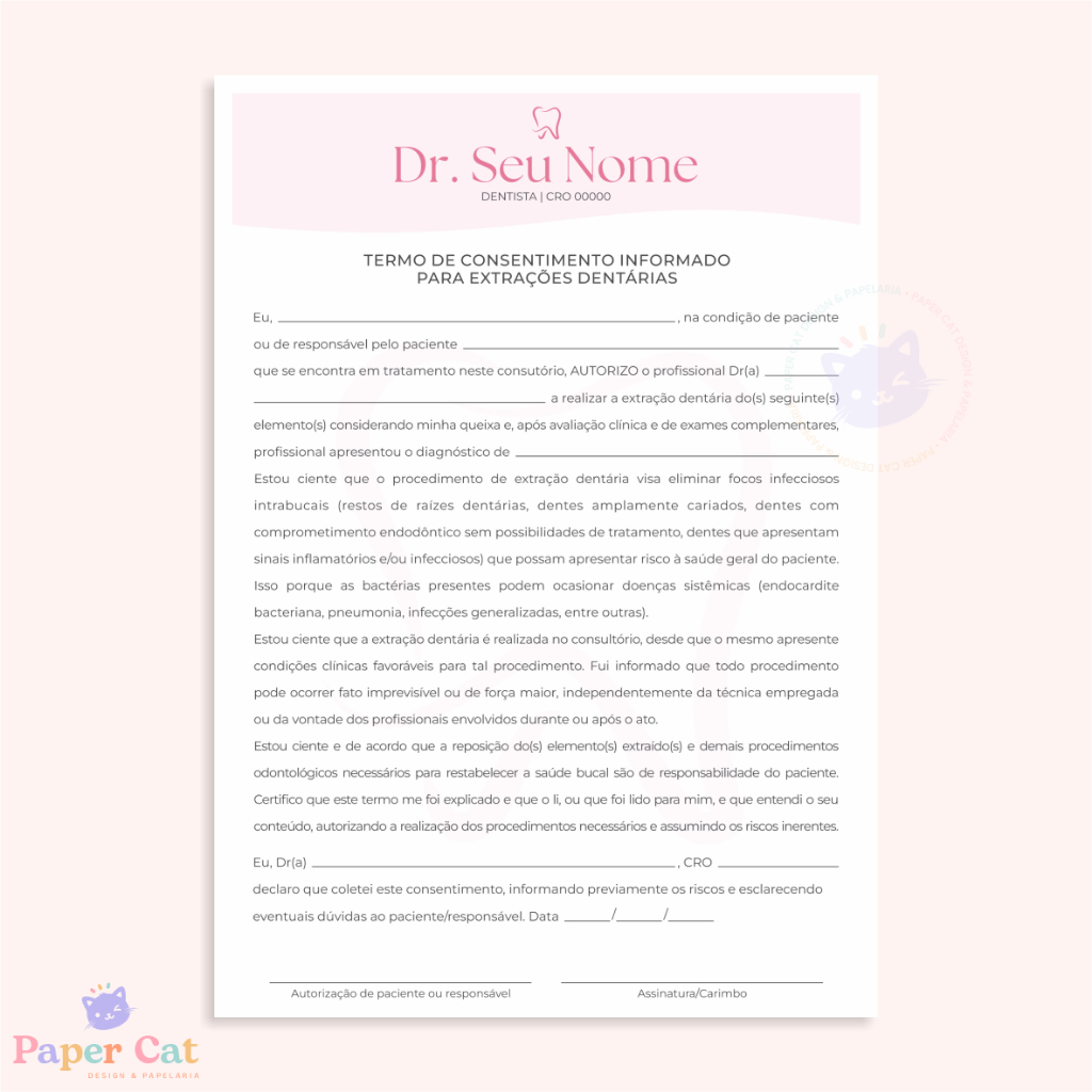 Bloco Termo de Consentimento Extração Dentária | Odontologia | Personalizado | Tamanho A5 | 50 Folhas