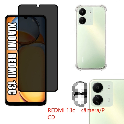 Kit Capa Capinha Xiaomi Redmi 13C + Película 3D Privacidade SPY + Câmera