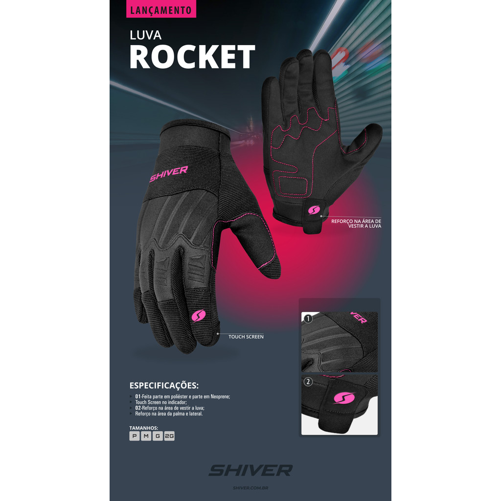LUVA MOTO MOTOQUEIRA MOTOCICLISTA PILOTA SHIVER ROCKET FEMININA PRETO e ROSA PROTEÇÃO RACING SPEED CANO BAIXO