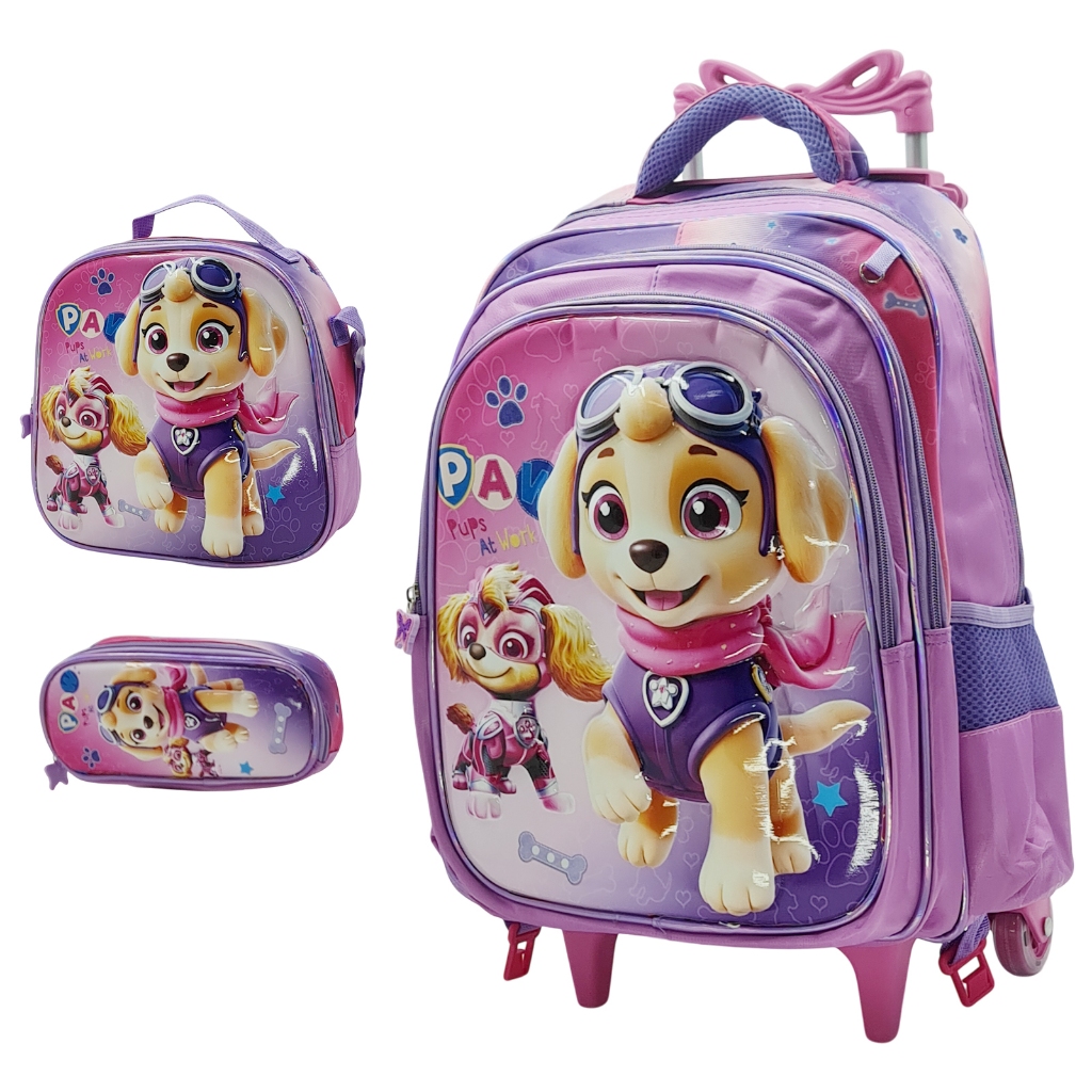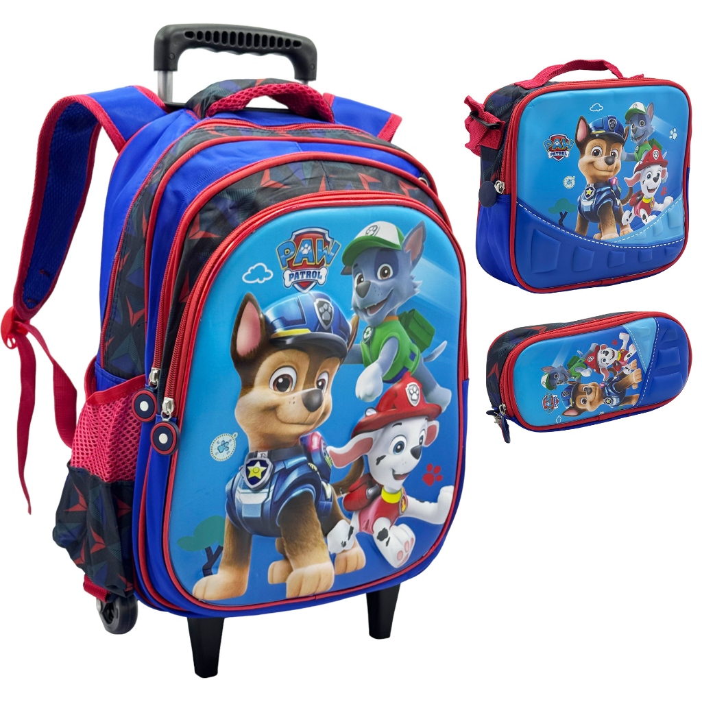 Mochila Escolar Infantil Carrinho Kit Com Estojo Lancheira Térmica Impermeável Rodinhas 3 Peças Menino e Menina Patrulha