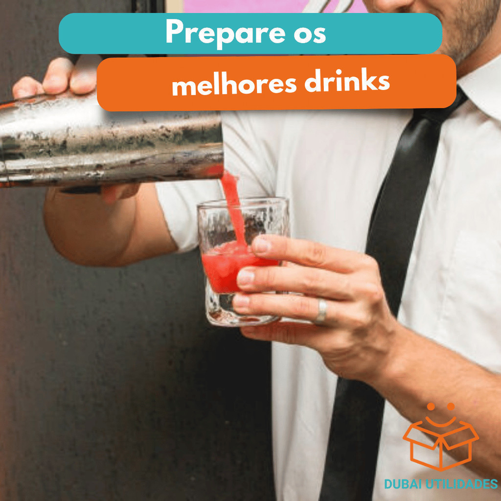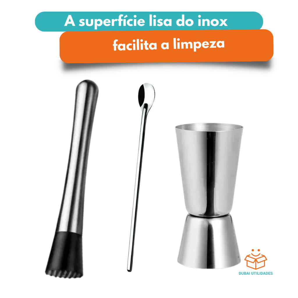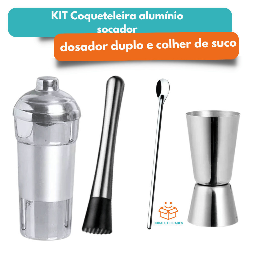 Kit Combo Bar 4 Peças Coqueteleira Alumínio socador dosador duplo e colher de suco para Bares Restaurantes