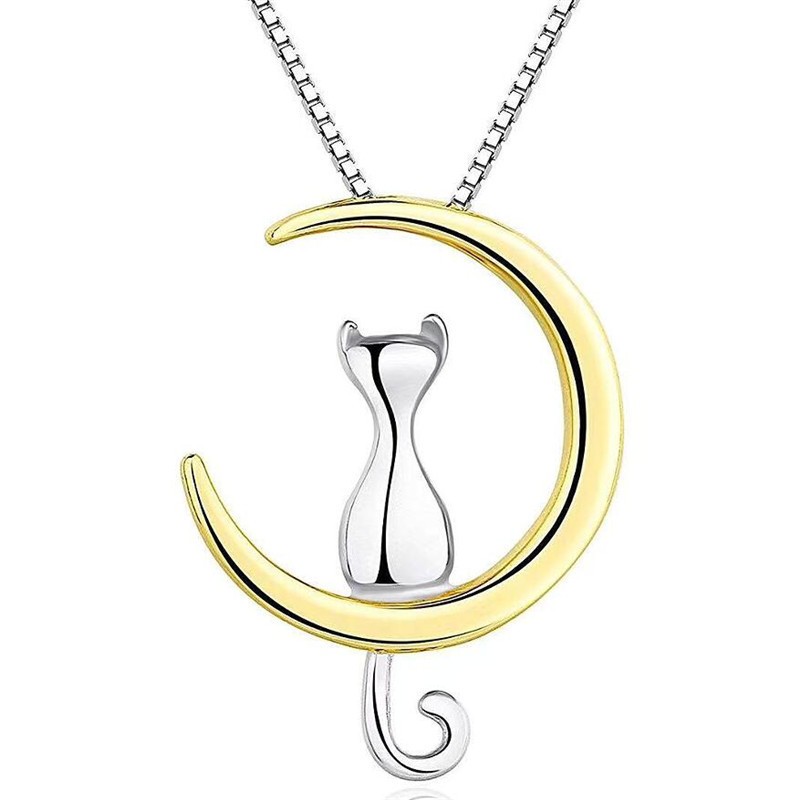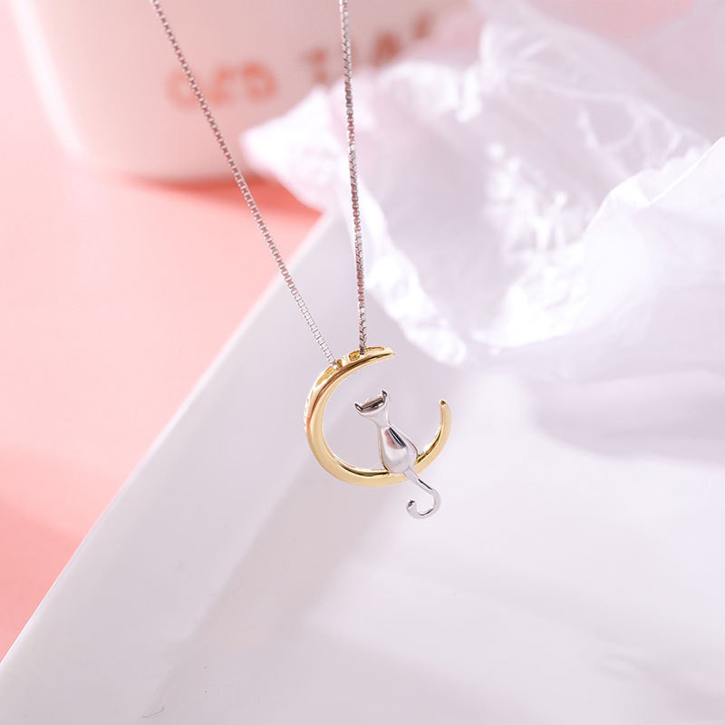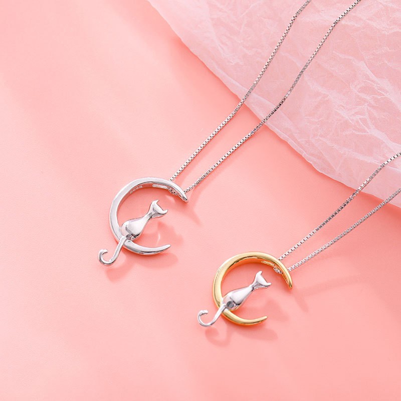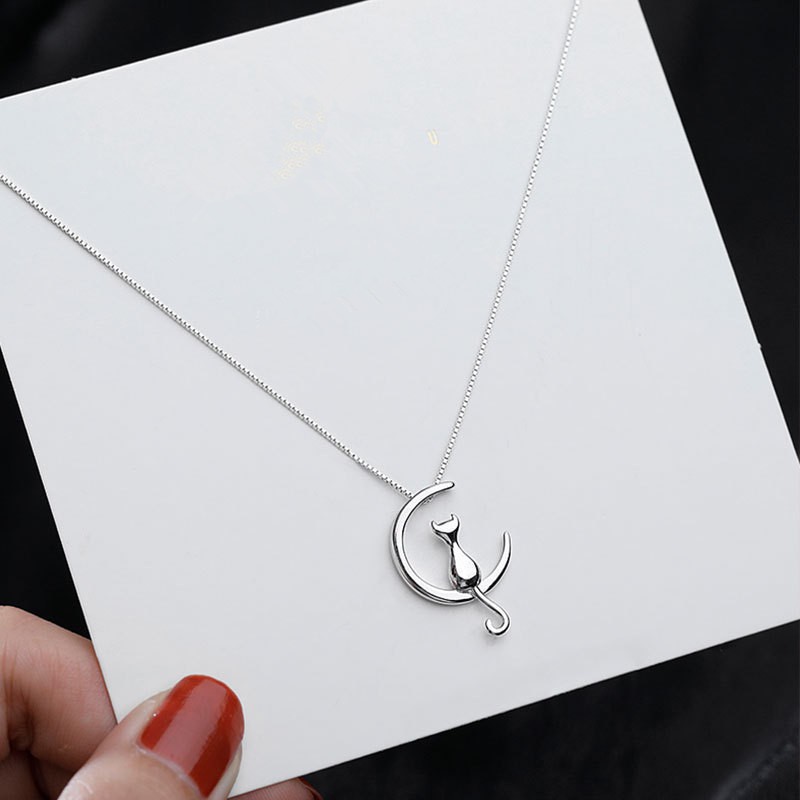 Lindo Moda 925 Sterling Silver Moon Cat Pendant Colar Fêmea XN153