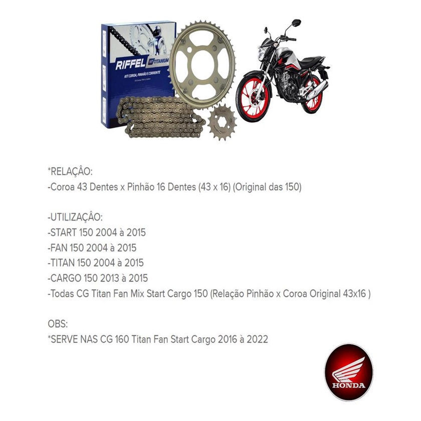 Kit Relacao Tracao Transmissao Cg Titan Fan 150 2005 Á 2015 Original Riffel