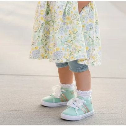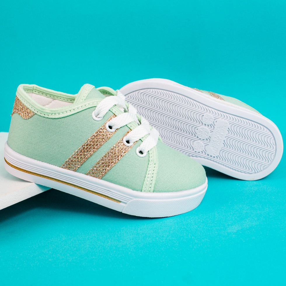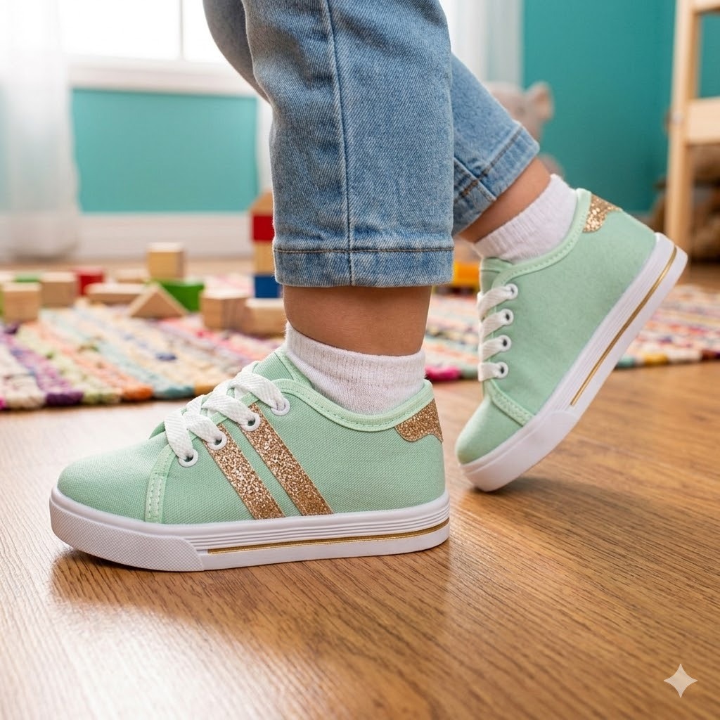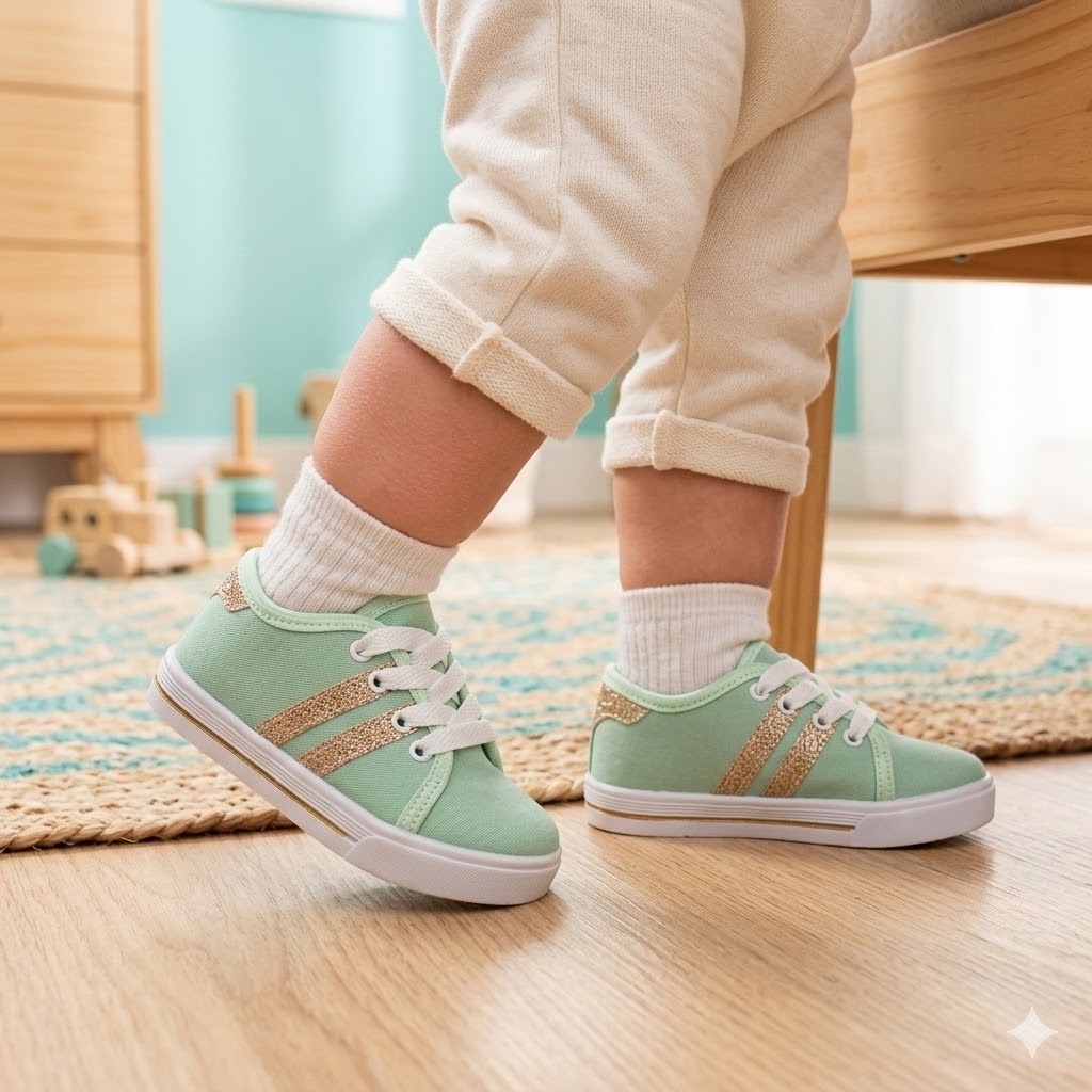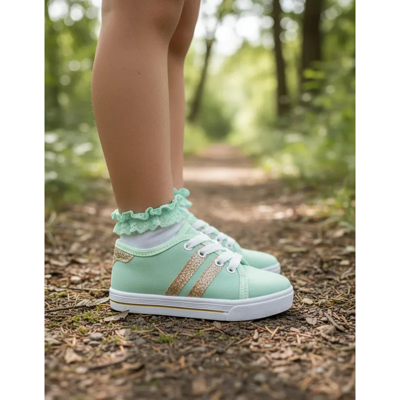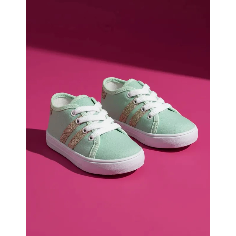 Tênis Infantil Menina Cano Baixo Verde com Tiras de Glitter Dourado Estilo Volta as Aulas Dia a Dia