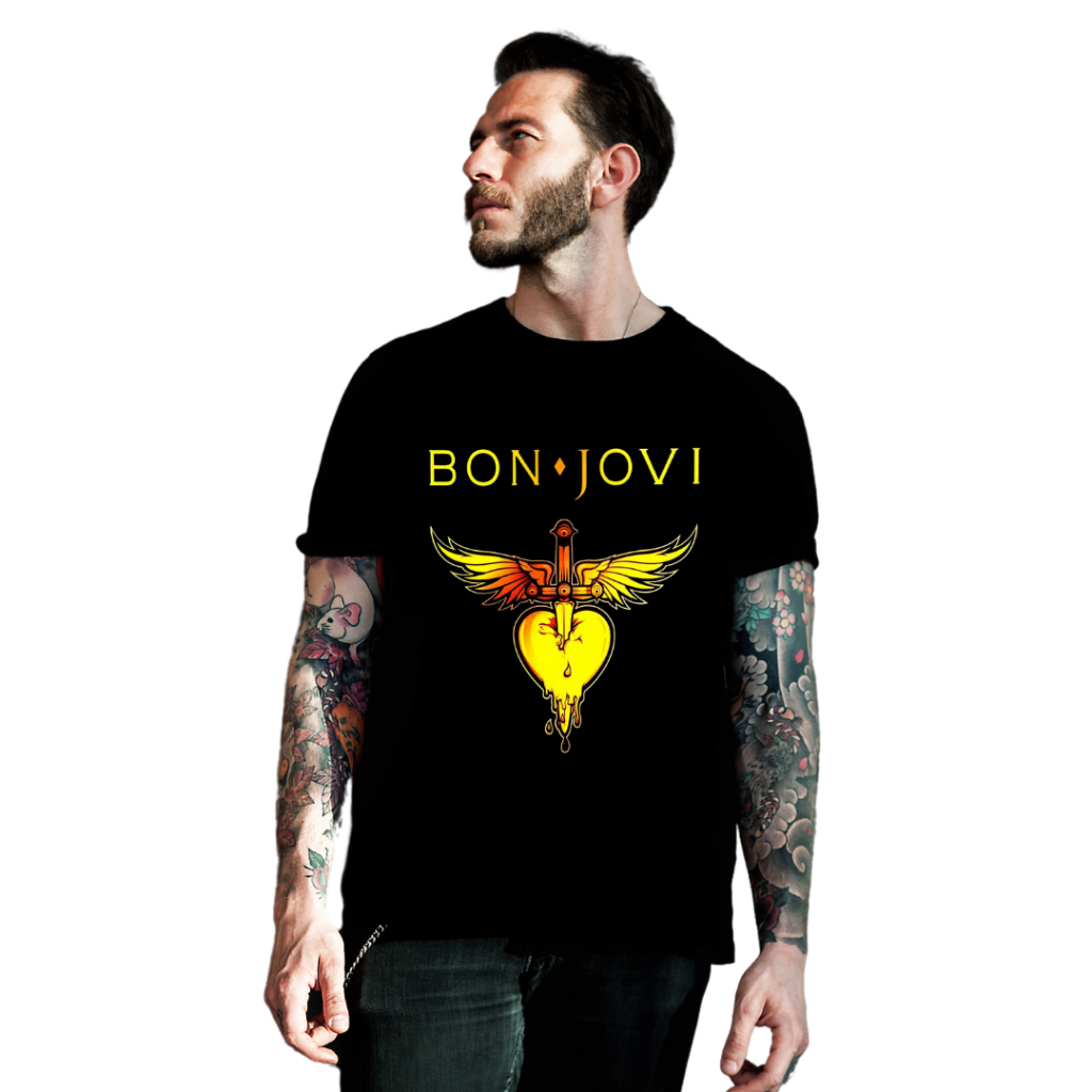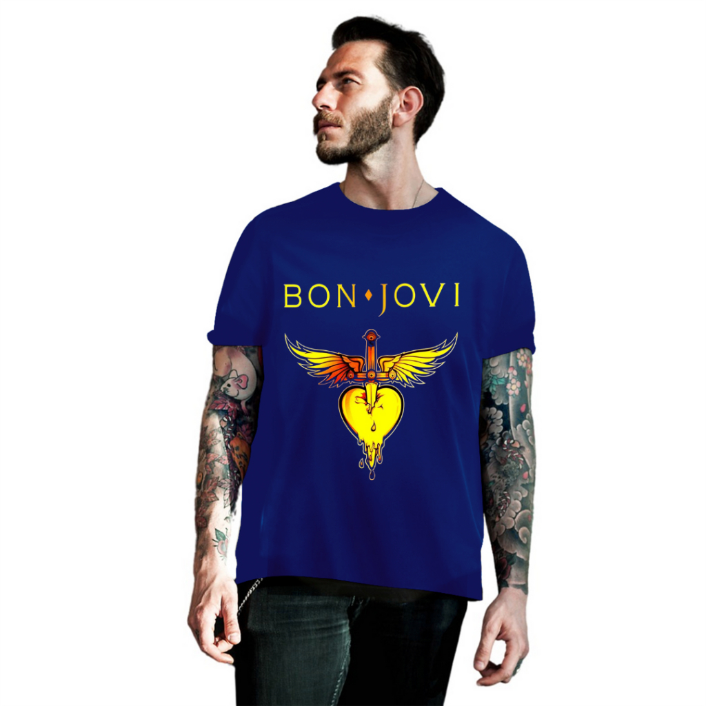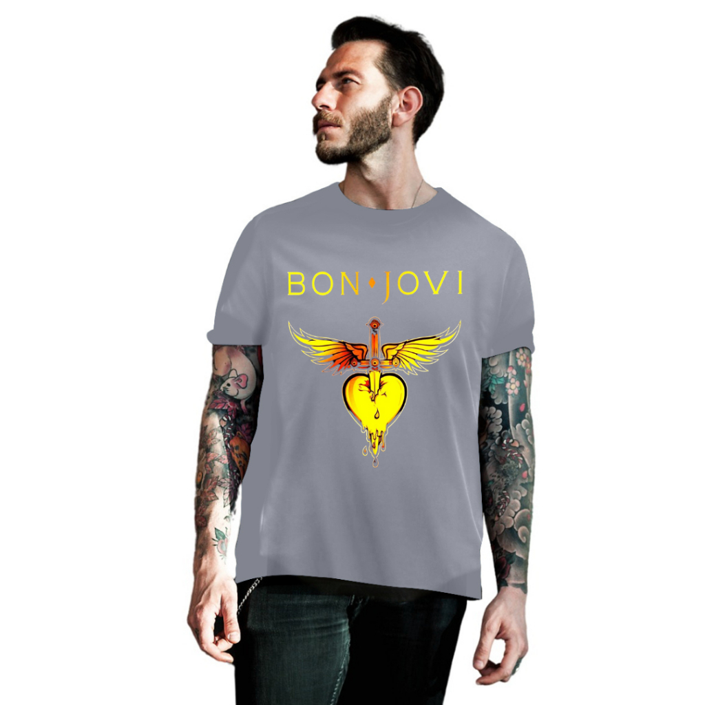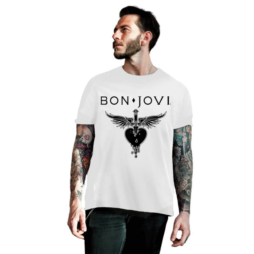 Camiseta Camisa Bon Jovi Banda de Rock Blusa 100% Algodão Preto Cinza Azul Marinho e Branco