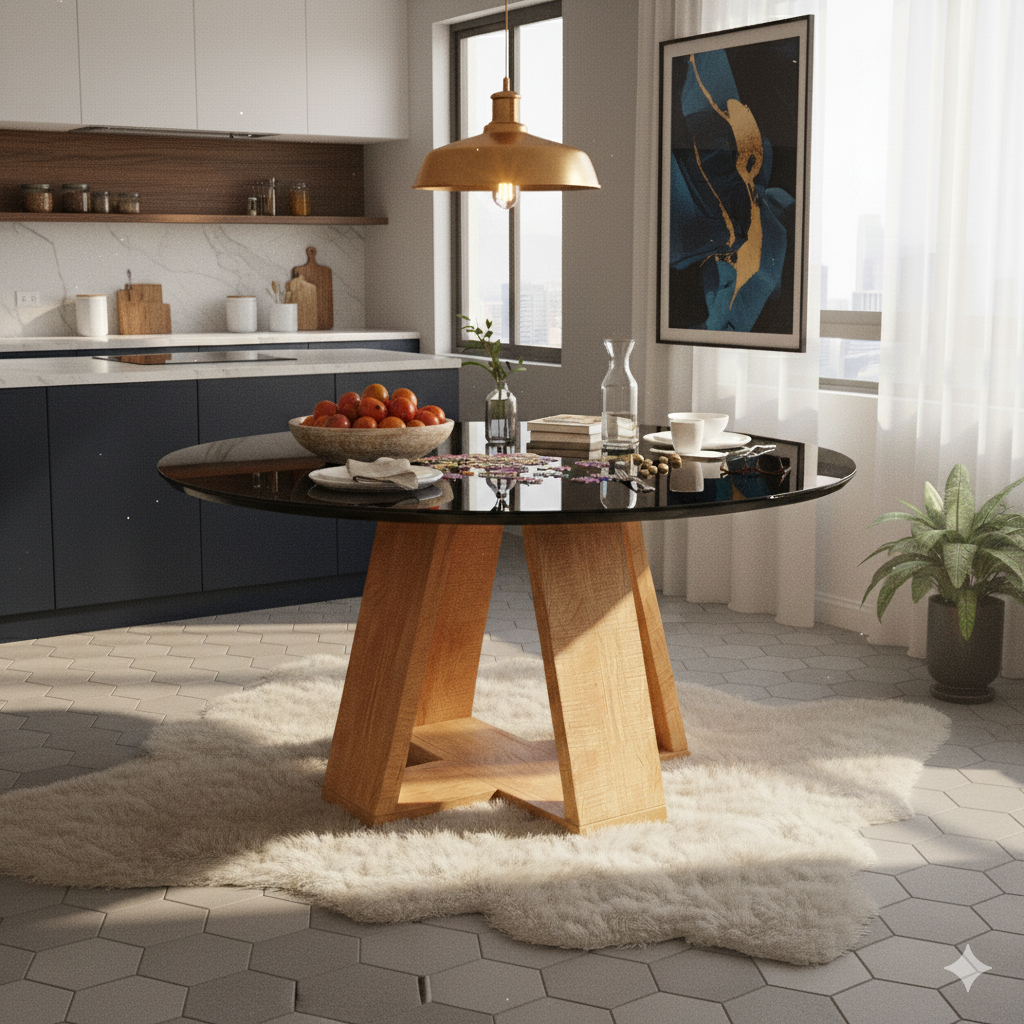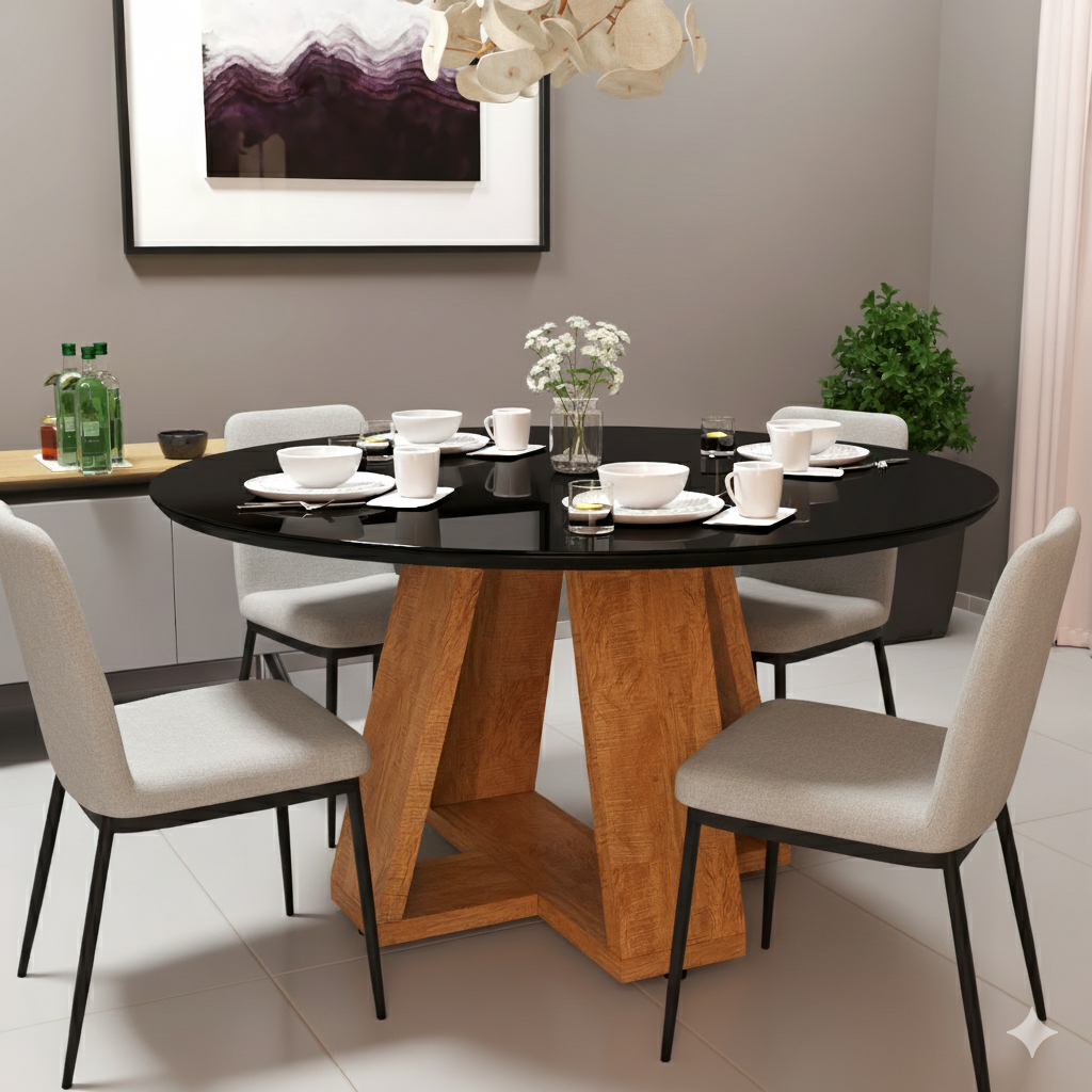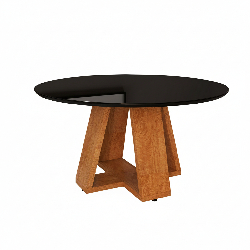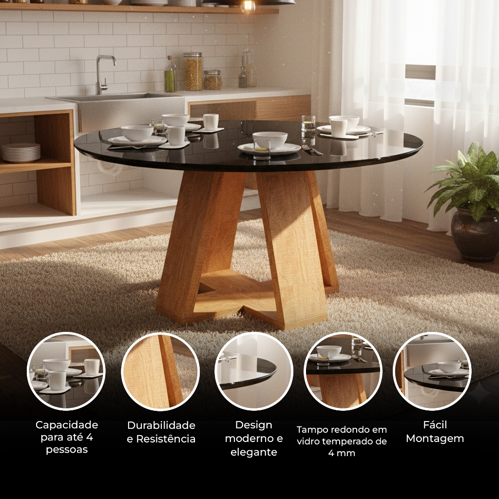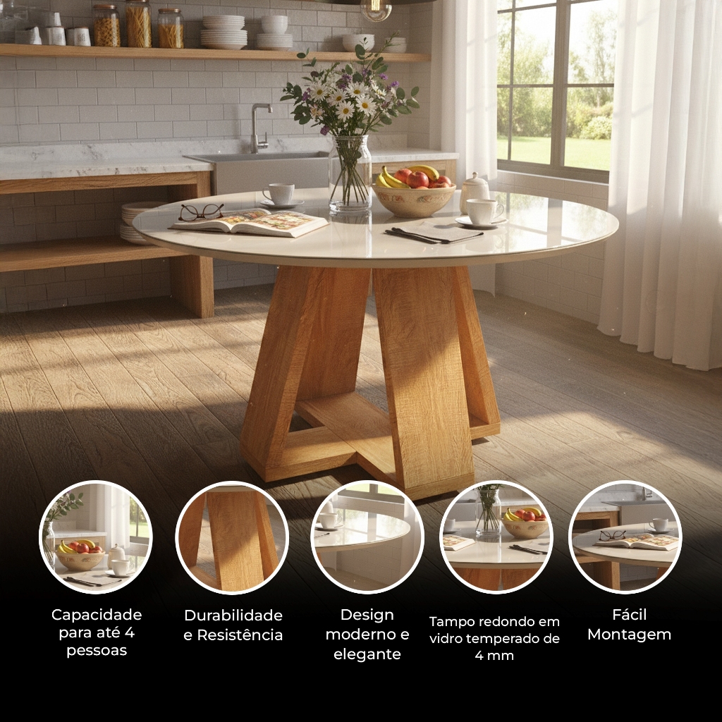 Mesa de Jantar Redonda 90cm com Tampo de Vidro e Pés em MDF – Off White ou Preto