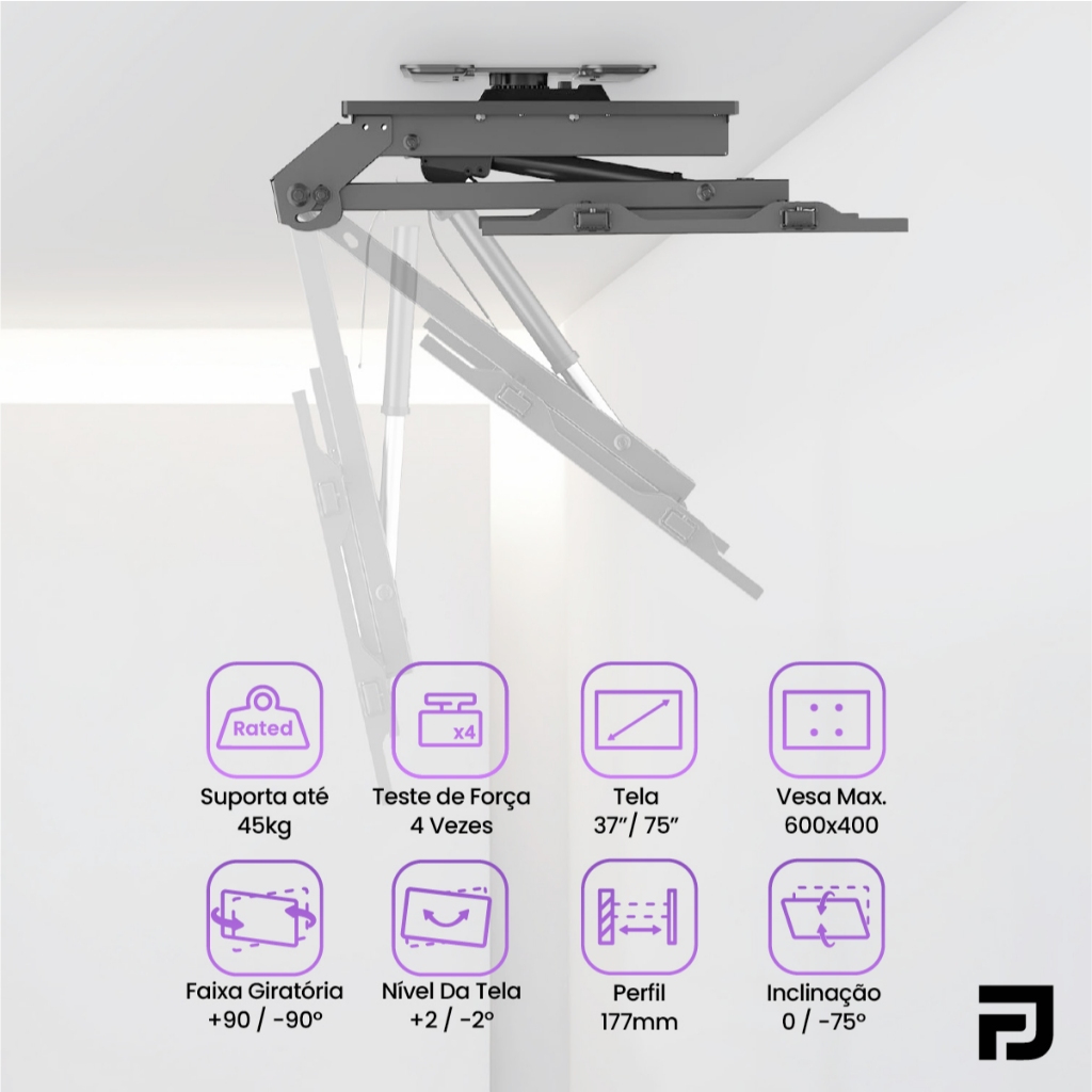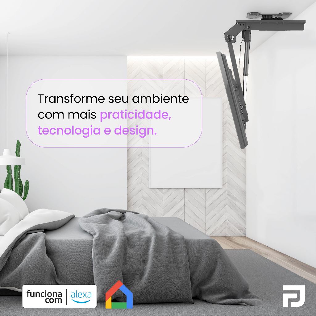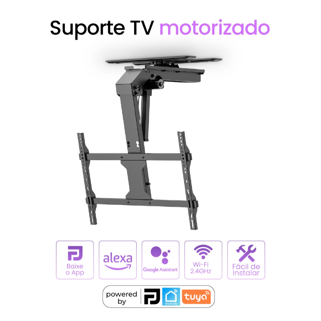 Suporte TV Teto Motorizado 37 a 75 Controle App Wifi Alexa Tuya Smartlife PandaPlus Google Rotação 180° Inclinação 75°
