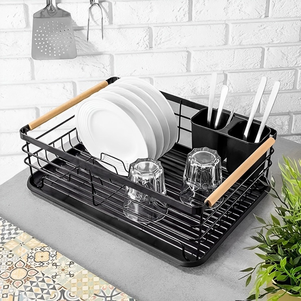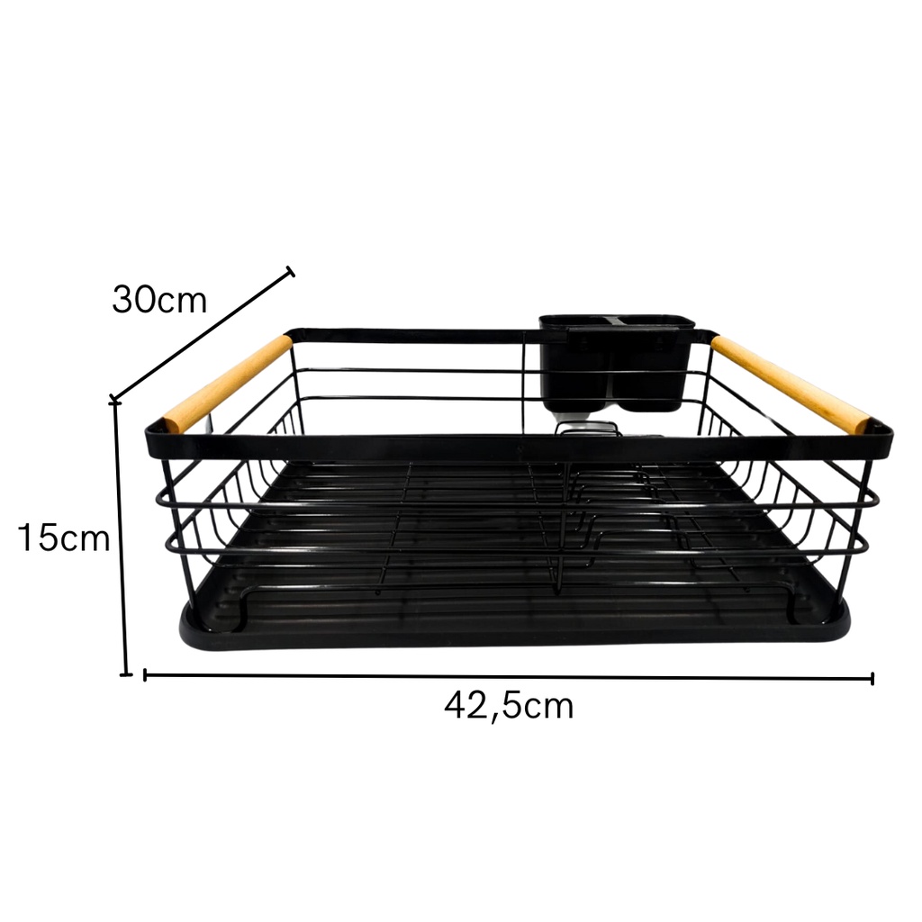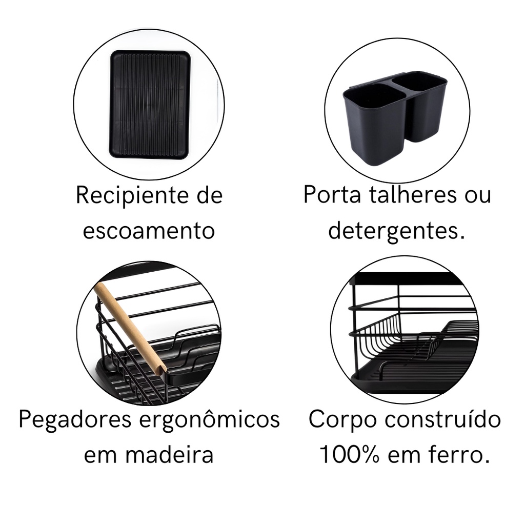 Rack Escorredor de pratos com Bandeja Preto Escorredor de Louças Ferro Cabo em Madeira 9 Pratos