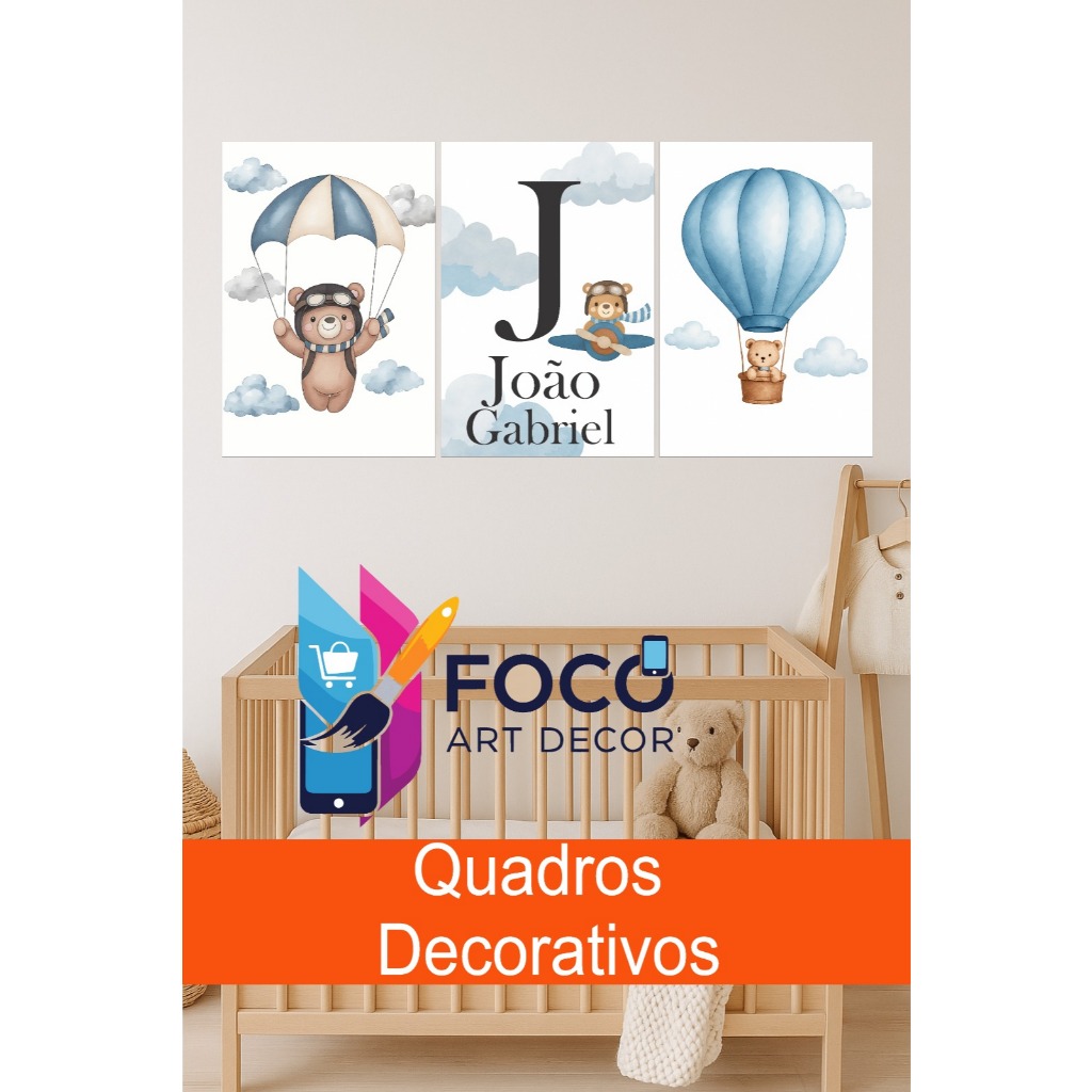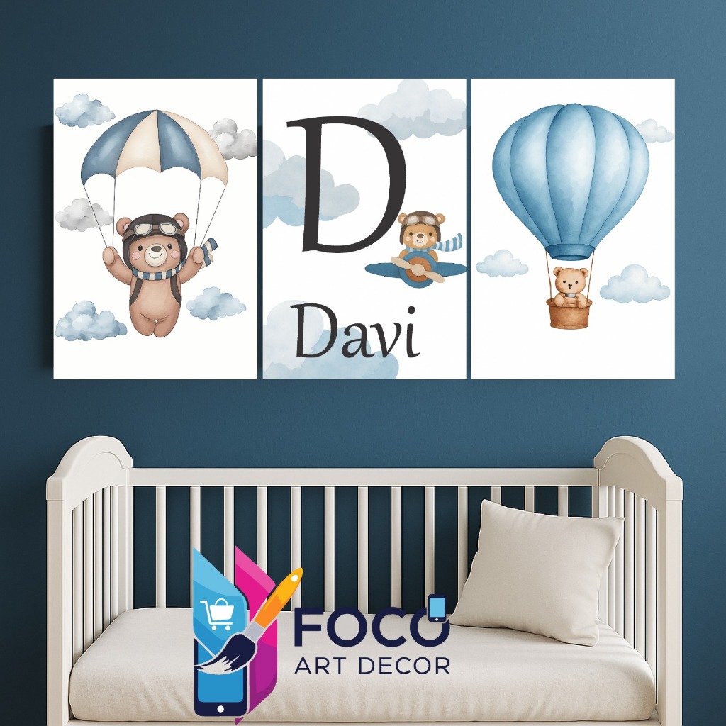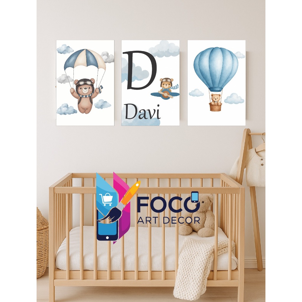 Kit plaquinha 3 peças personalizada ursinho balão, para decoração infantil quarto de menino.