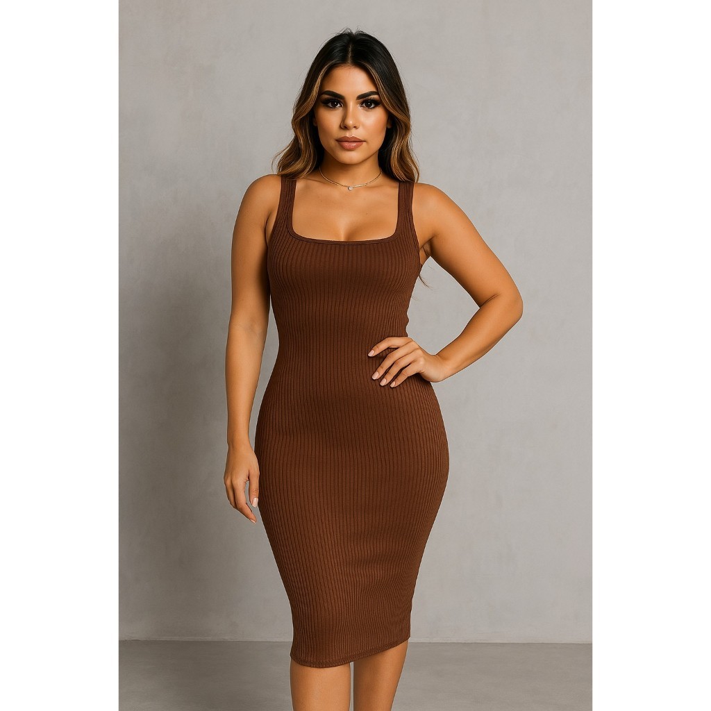 Vestido Feminino Colado Midi Tubinho Canelado Decote Modinha Blogueira Tendência
