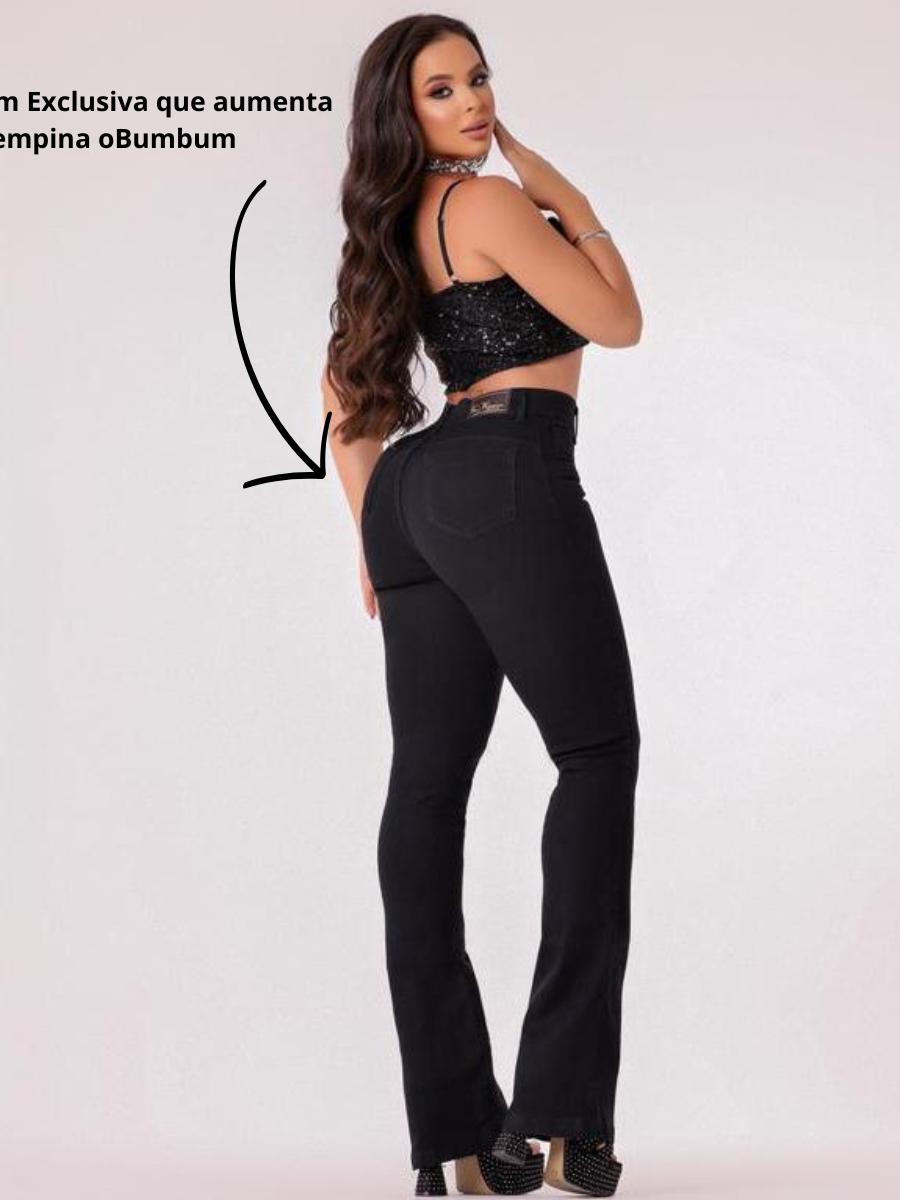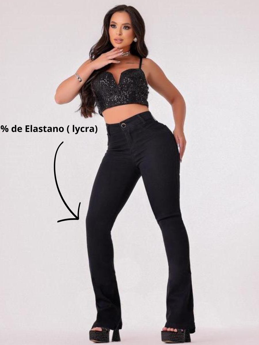 Calça Jeans Feminina flare Preta Boca de sino Elastano Lycra Levanta Bumbum