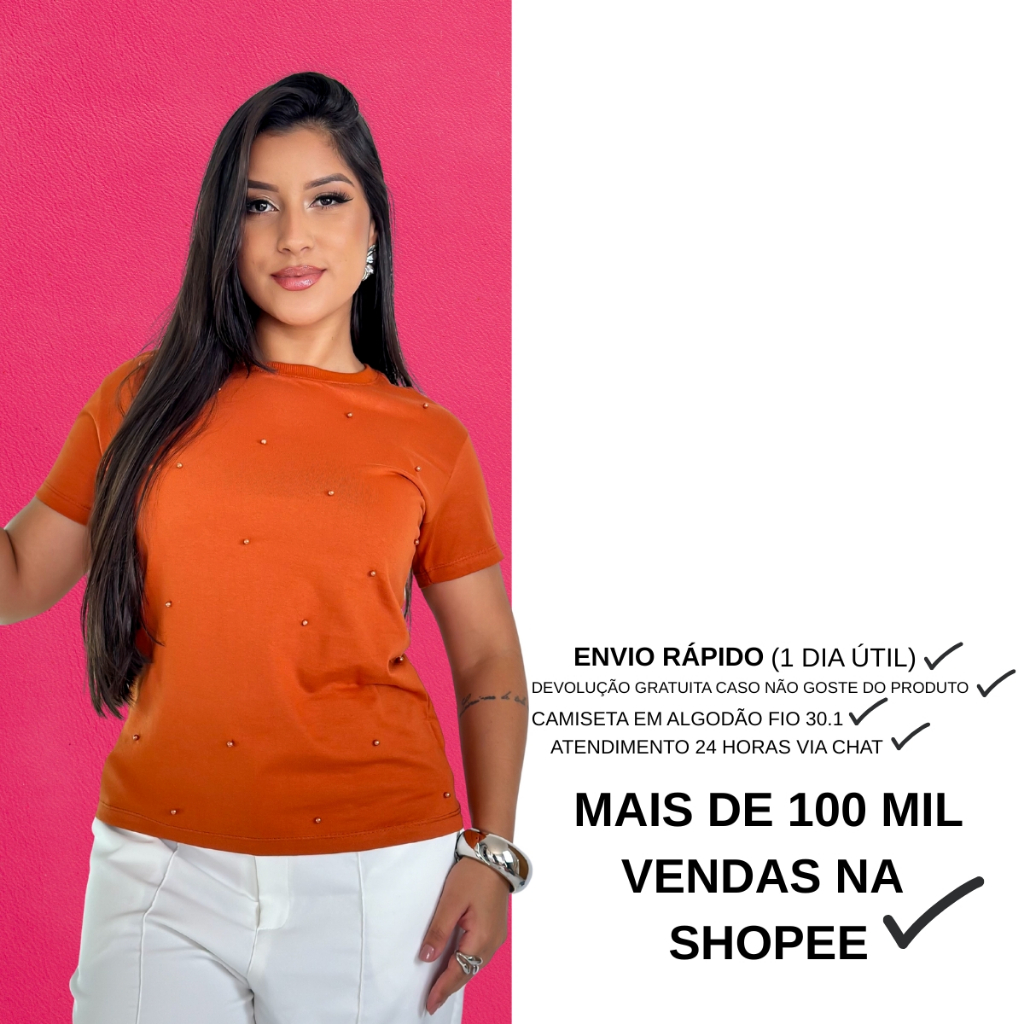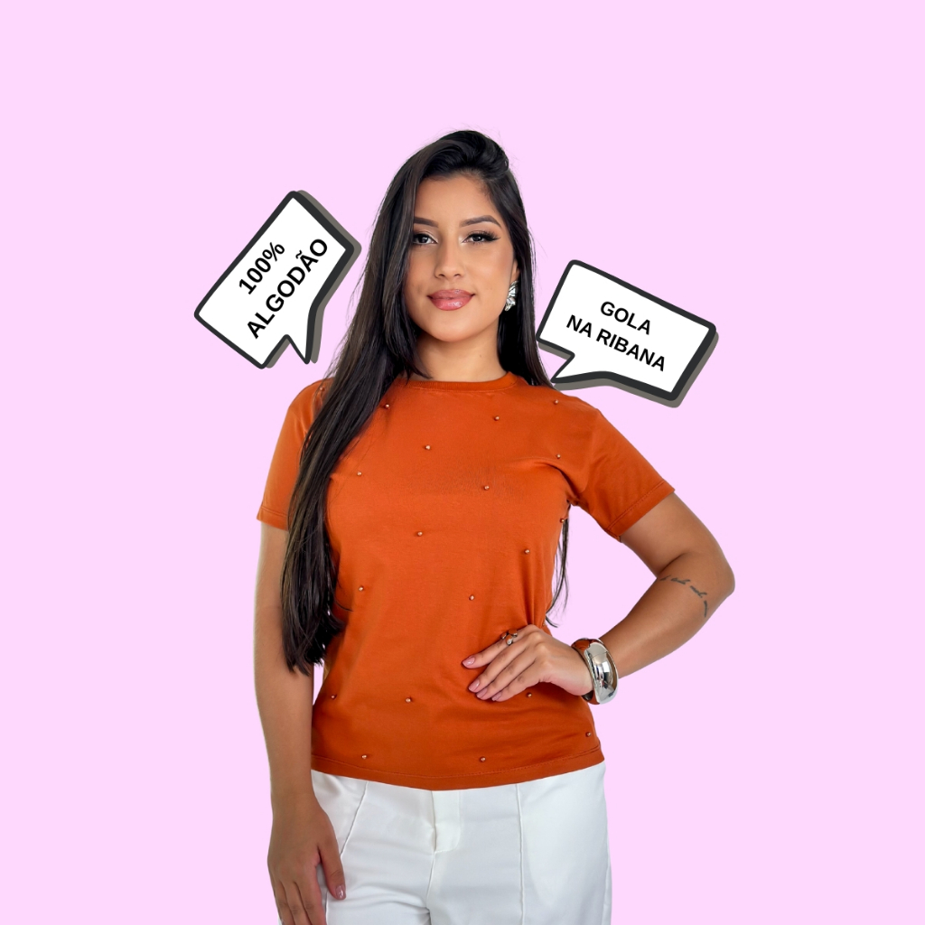 Blusa Feminina Com Pérolas Terra Cota T-shirt Básica Moda Casual
