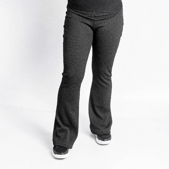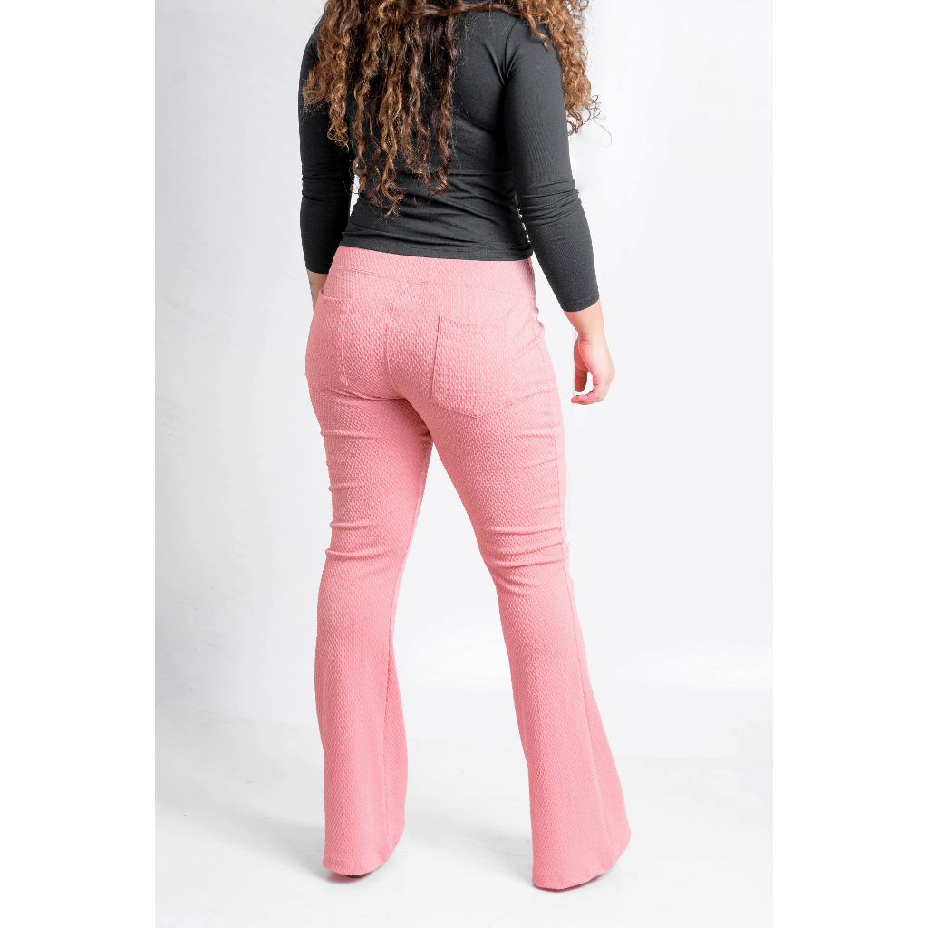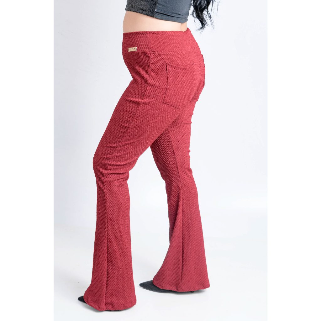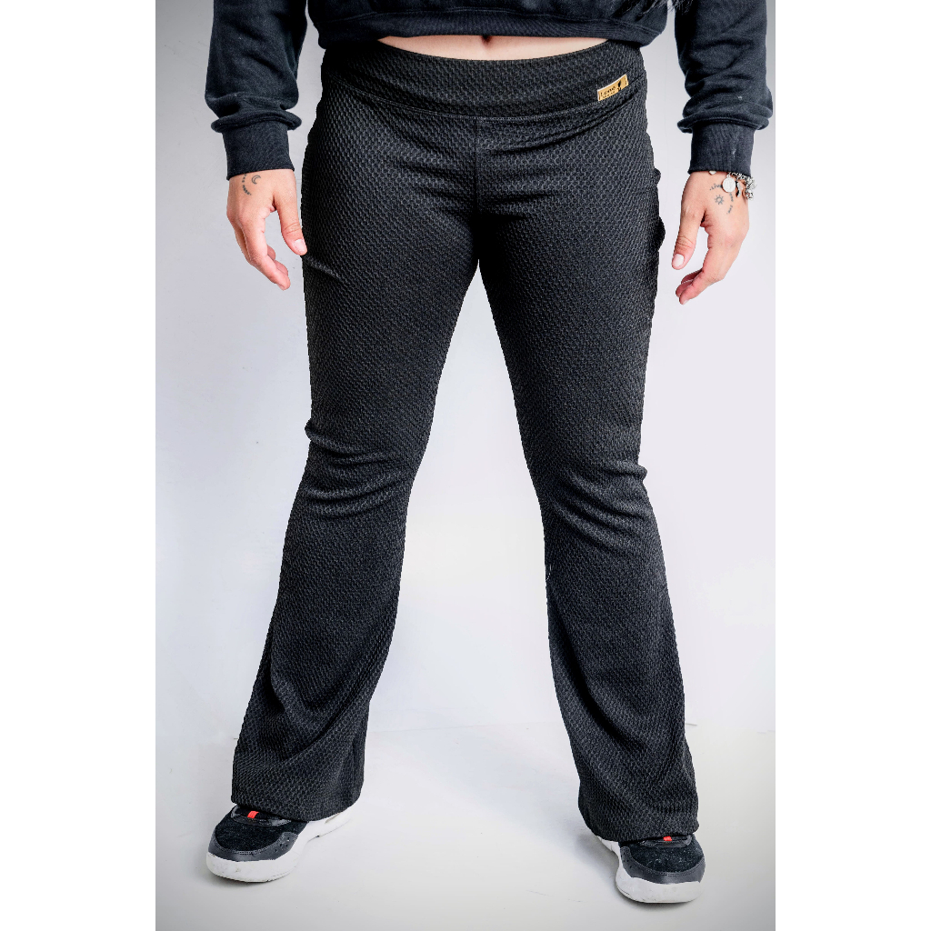 Calça Flare Com Bolso Colmeia Boca de Sino Bailarina Cintura Alta