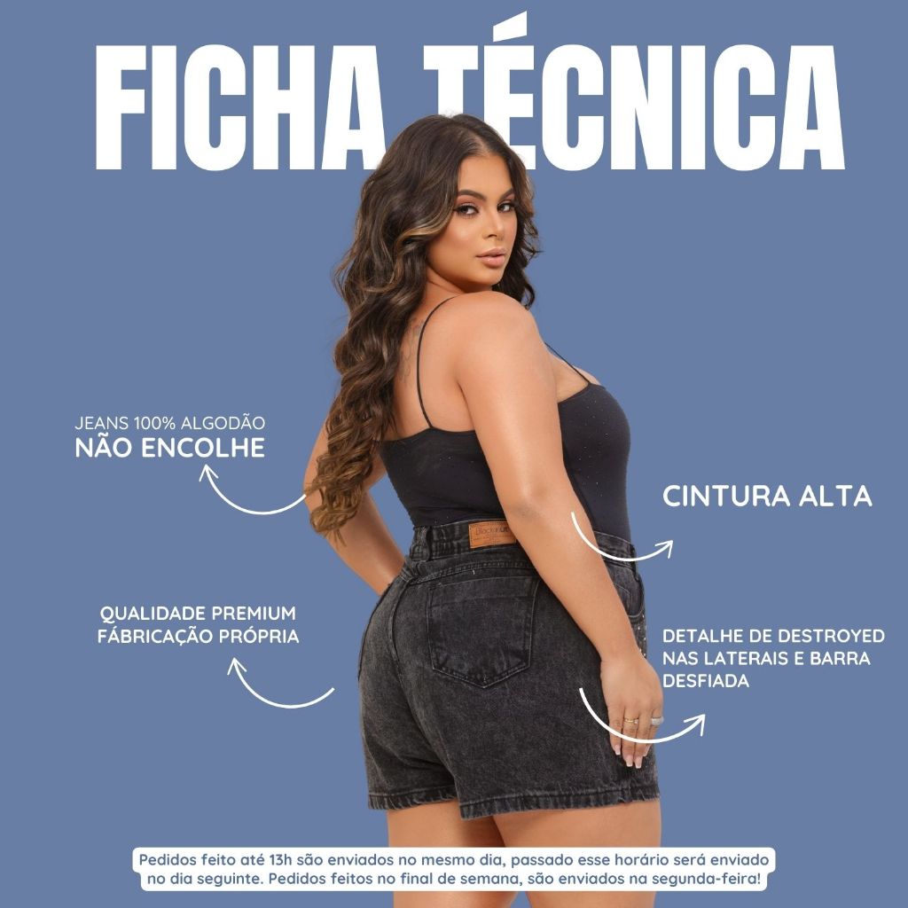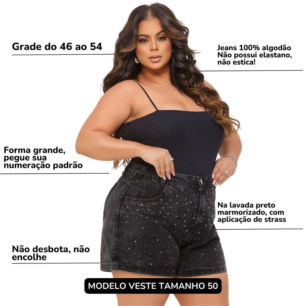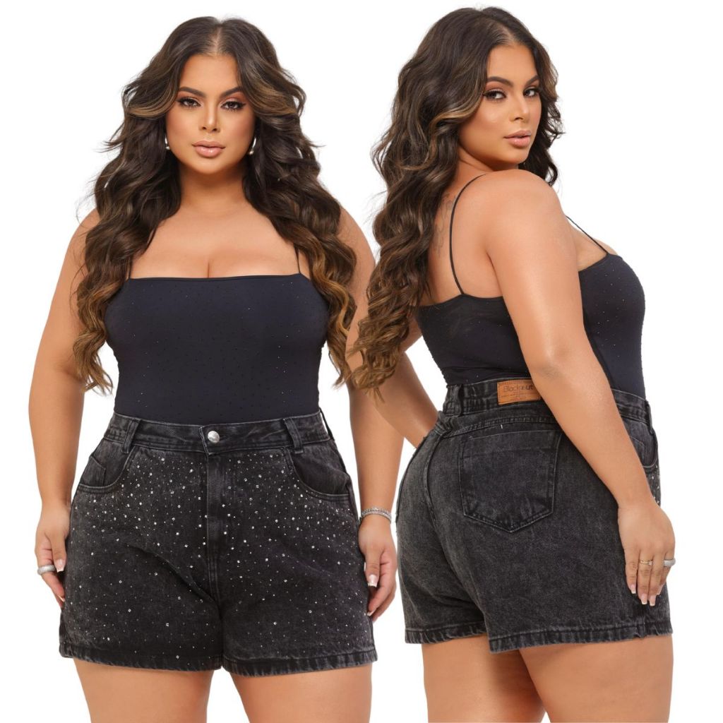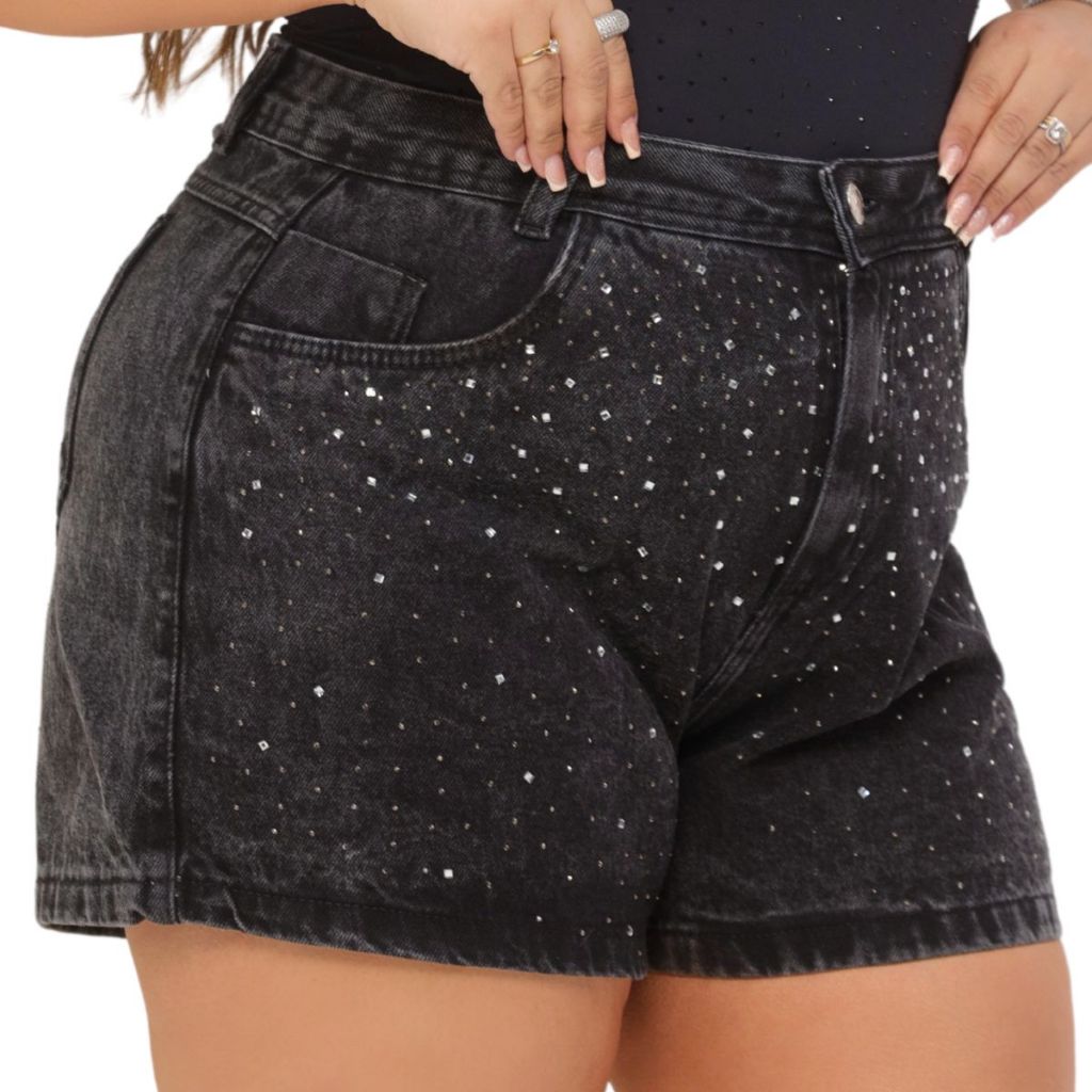 Short Jeans Feminino Plus Size Preto Marmorizado Strass Jeans 100% Cintura Alta Brilho Moda Maior