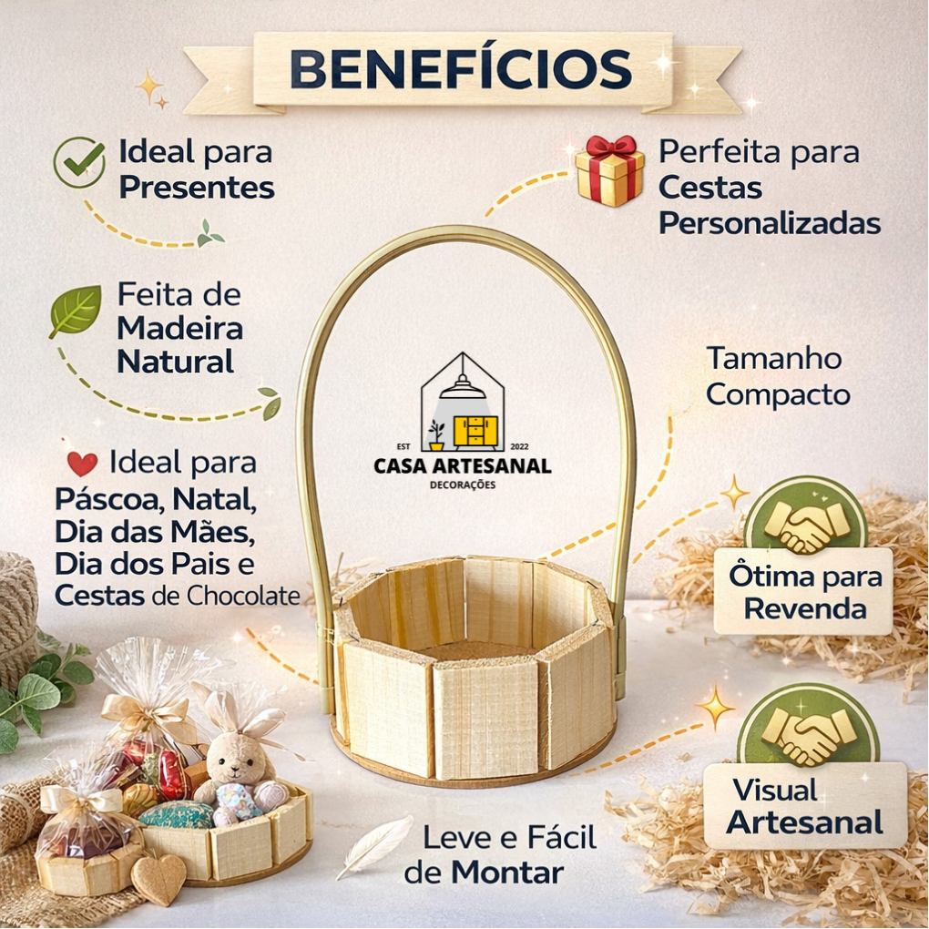 Kit com 5 Cestas de Madeira 13cm Pequena | Cesta de Presente, Chocolate, Páscoa e Dia das Mães