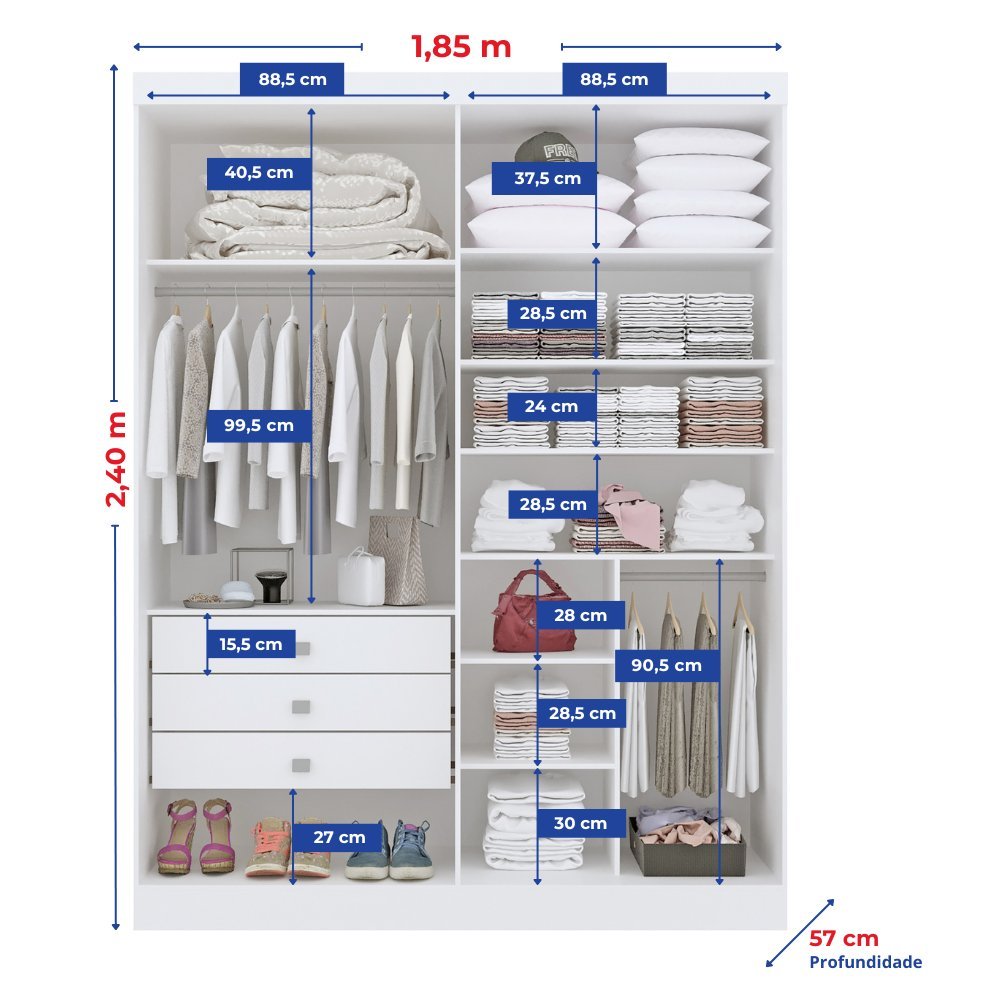 Guarda Roupa Solteiro MDF 4 Portas 3 Gavetas Paris Plus Branco