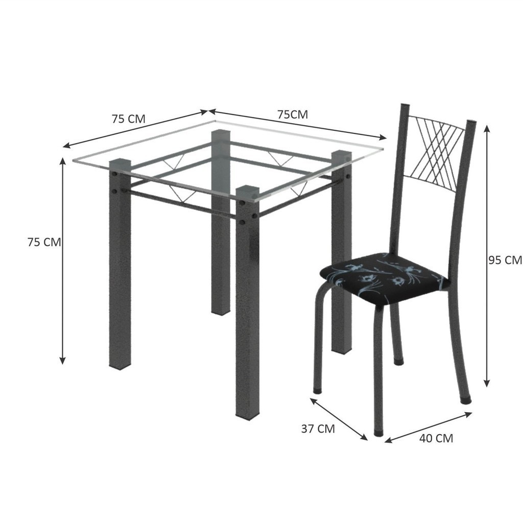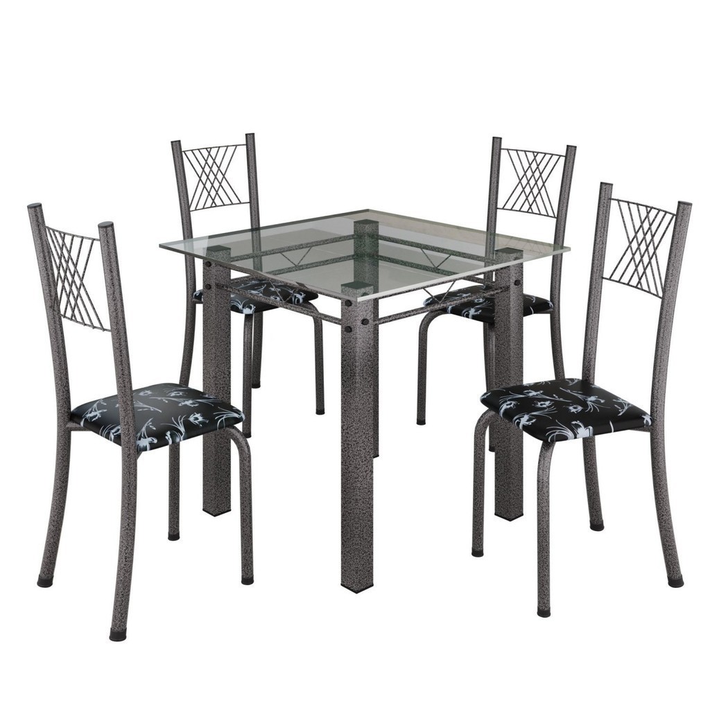 Conjunto de Jantar Mesa 75x75cm Tampo de Vidro Incolor com 4 Cadeiras Sara Yescasa Preto Floral/Prata
