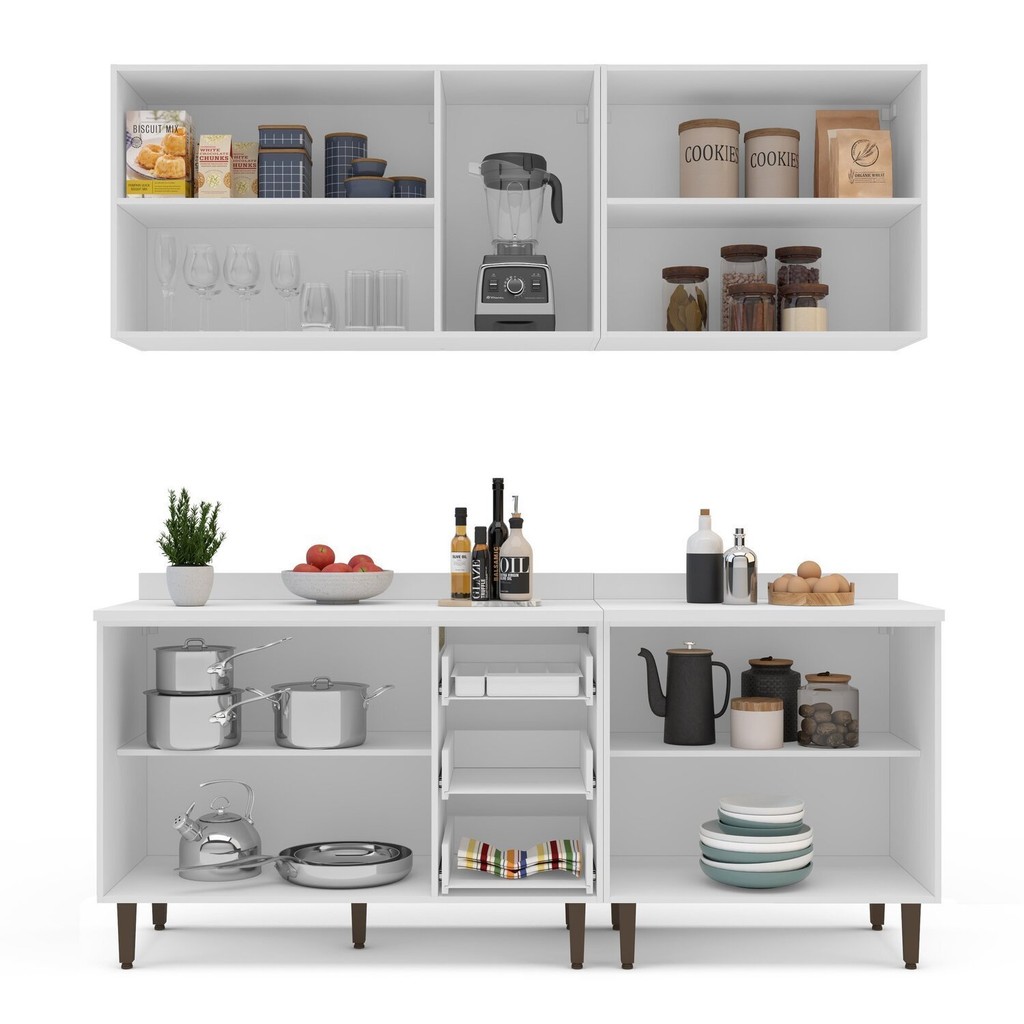 Cozinha Pérola com Tampo 4 Peças Aéreos com 5 Portas, Balcão 2 Gavetas 3 Portas e Balcão 2 Portas Ye Branco/Azul