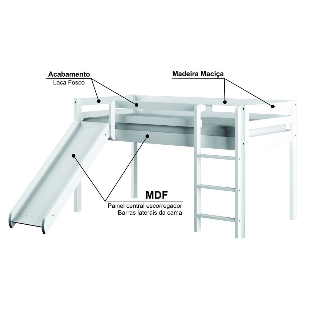 Cama Alta Infantil com Escorregador em Madeira Maciça/MDF Branco