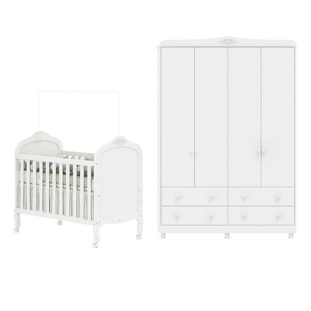 Quarto de Bebê com Berço Mini Cama e Guarda Roupa 4 Portas Maya Clássico Espresso Móveis Branco/Brilho