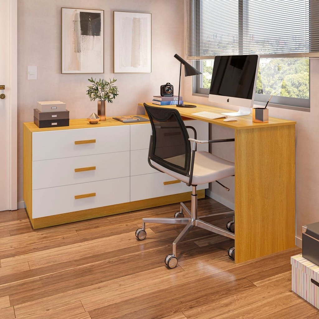 Escrivaninha Mesa Escritório em L com 6 Gavetas Cômoda 138cm Leonie Yescasa Freijó/Branco