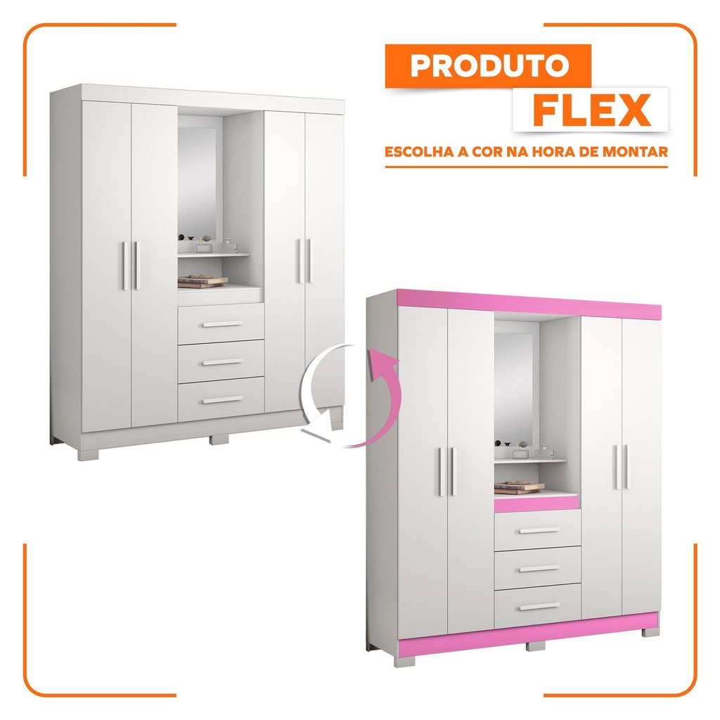 Guarda Roupa Casal com Espelho 4 Portas 3 Gavetas e Nicho Capelinha Branco New/Rosa
