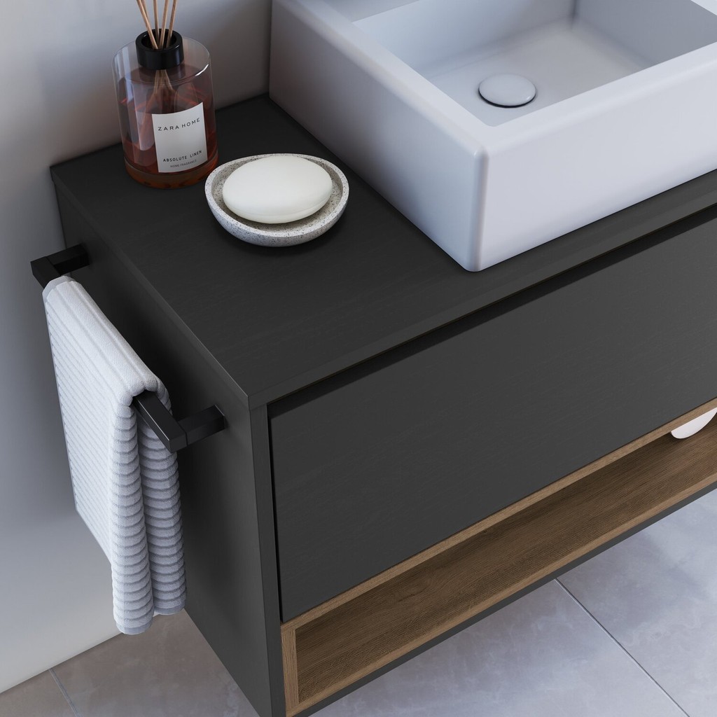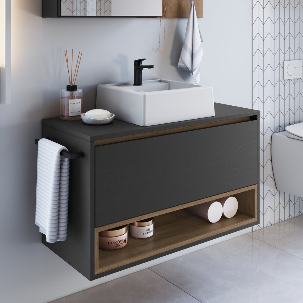 Gabinete de Banheiro Suspenso 80cm com 1 Nicho 1 Toalheiro 1 Porta com Cuba Mel/Grafite