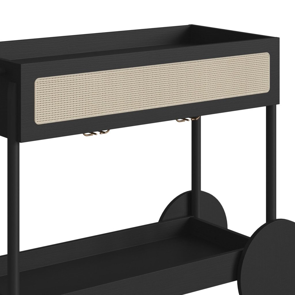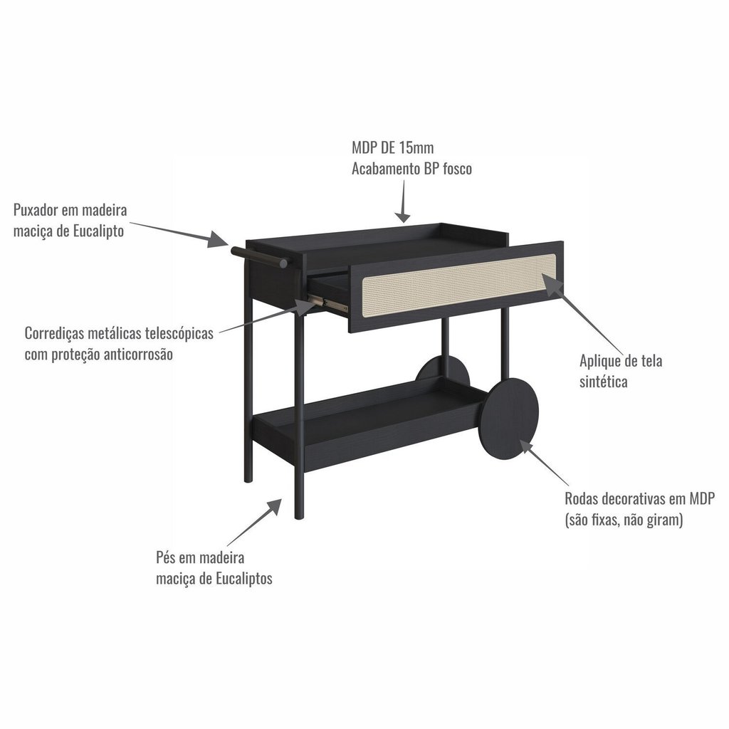Carrinho Bar 1 Gaveta 112cm com Porta Taças Palhinha Pé Madeira Oslo Nero/Preto