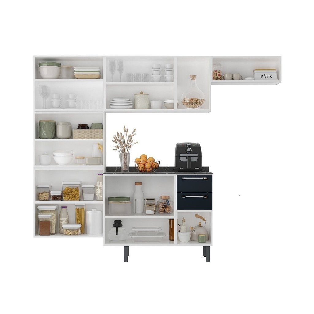 Cozinha Modulada Compacta em Aço 4 Peças 13 Portas Sendo 3 com Vidro 2 Gavetas Florença Itatiaia Branco/Grafite