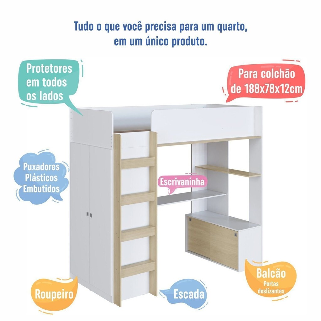 Cama Elevada Multifuncional com Armário e Escrivaninha Branco/Carvalho