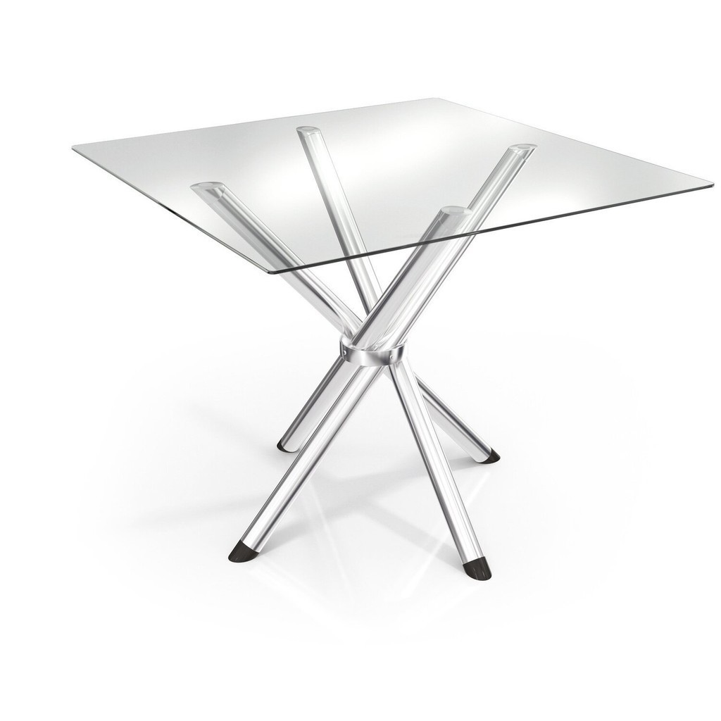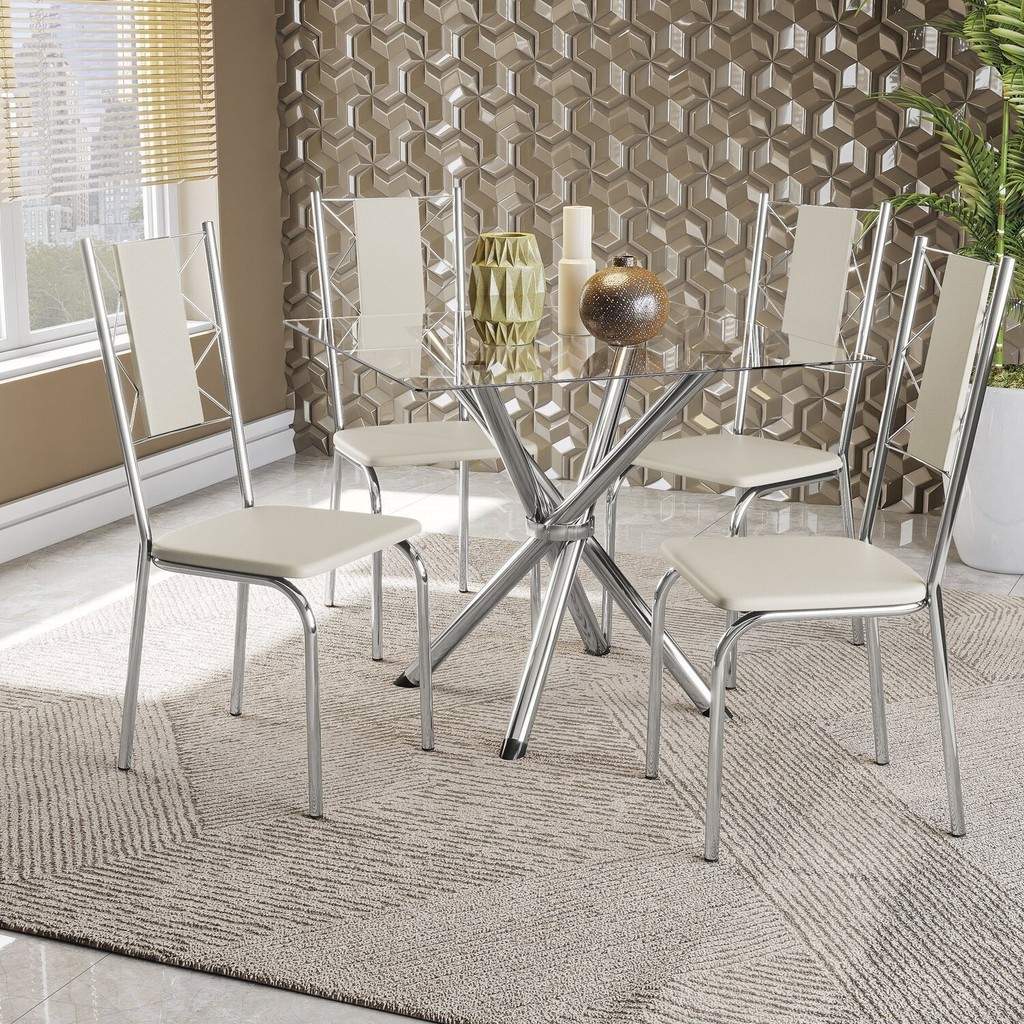 Conjunto Mesa Volga Tampo de Vidro e 4 Cadeiras Lisboa Cromado/Nude