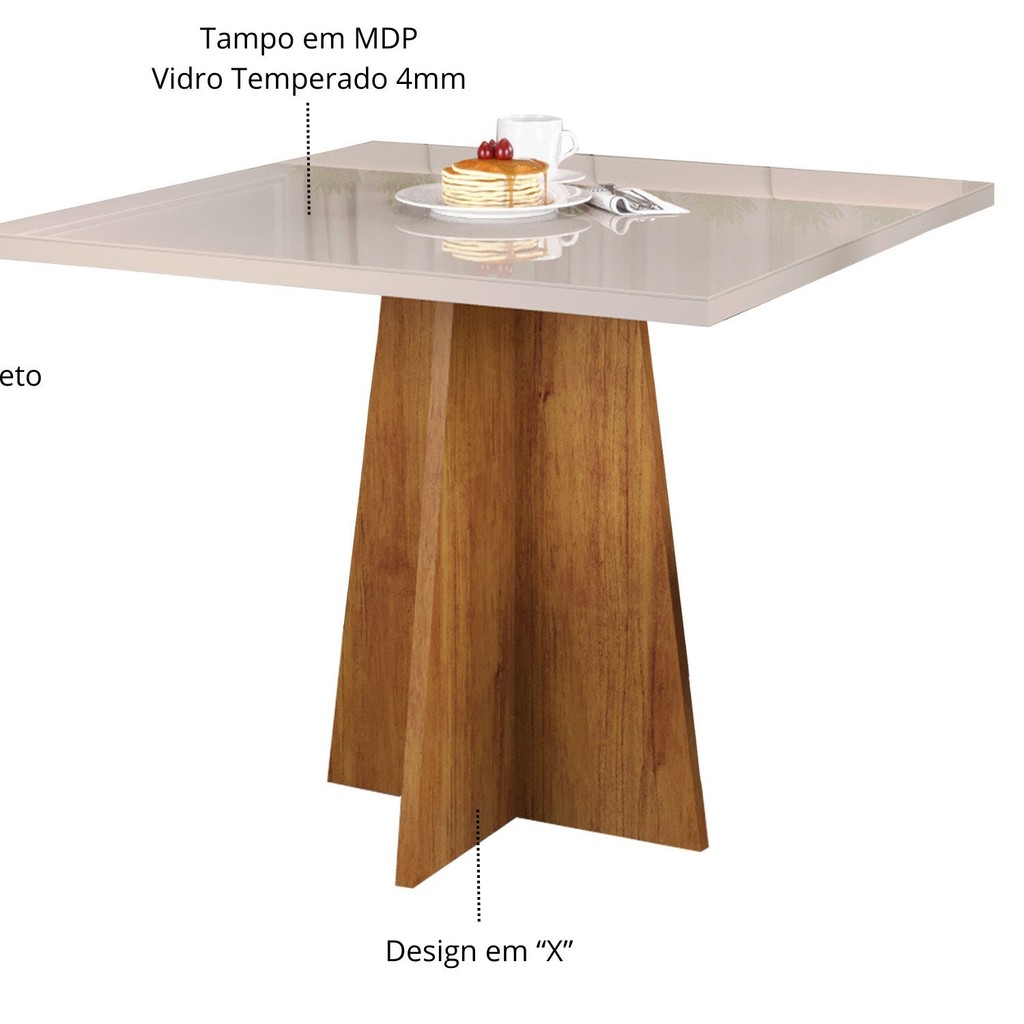 Conjunto Canto Alemão com Baú Trento Mesa Quadrada com Vidro 90x90 e 2 Cadeira Dallas em Mdp/mdf Mel/Marfim/Off White