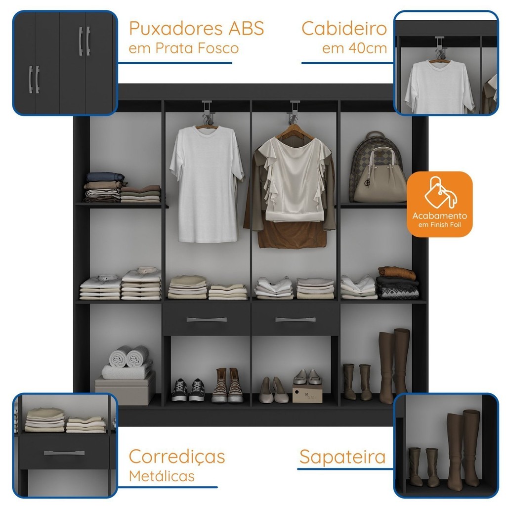 Guarda-roupa Casal 8 Portas 2 Gavetas 2 Basculante Rubi Yescasa Preto