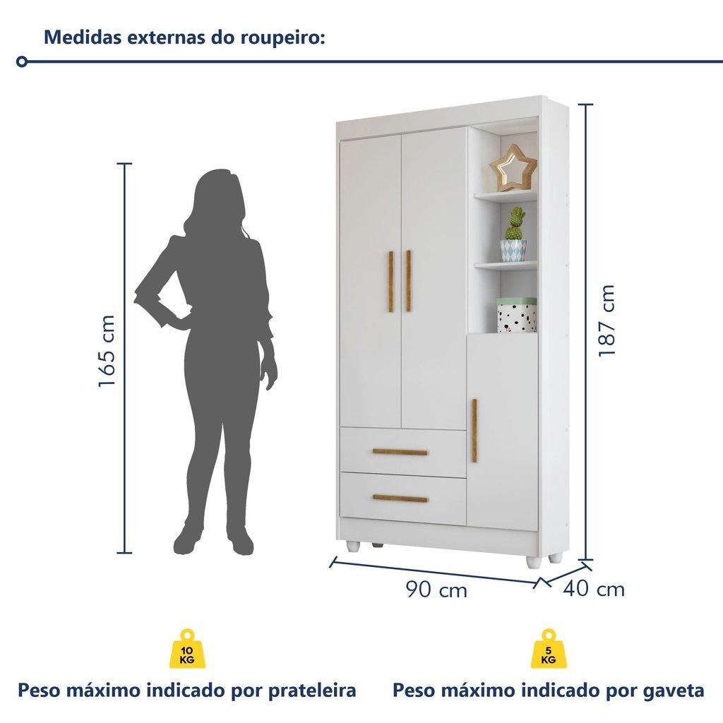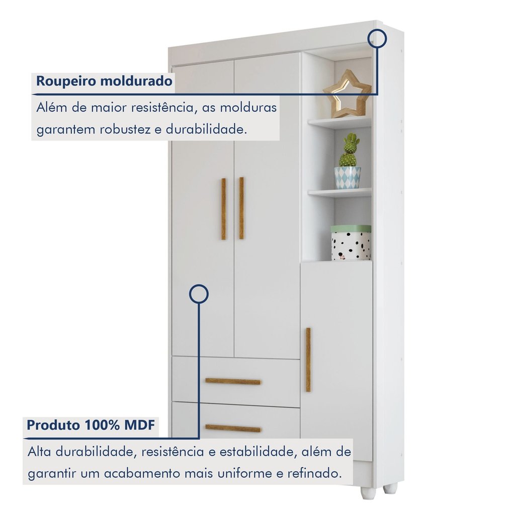 Guarda Roupa Infantil 100% MDF Flocos 3 Portas 2 Gavetas Branco/Ypê