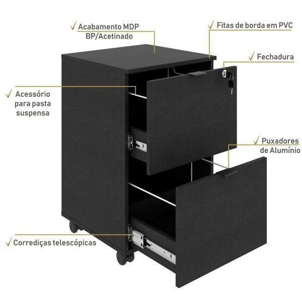 Gaveteiro Volante 2 Gavetas para Pastas Kugv42 Kuadra Espresso Móveis Preto Onix