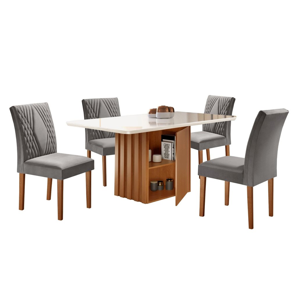 Conjunto Sala de Jantar Mesa Tampo Smart Plus Vidro 120x90cm com 4 Cadeiras Elis Yescasa Cinamomo/Off White/Suede Cinza
