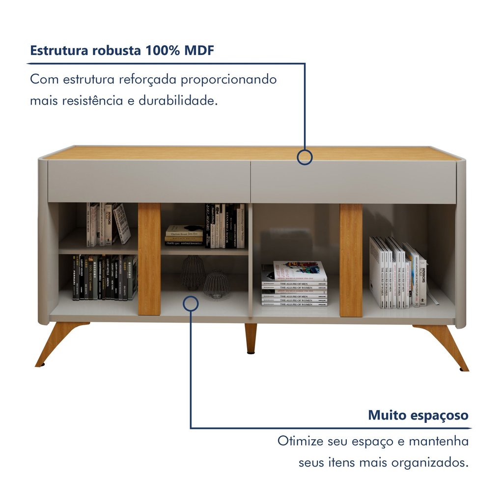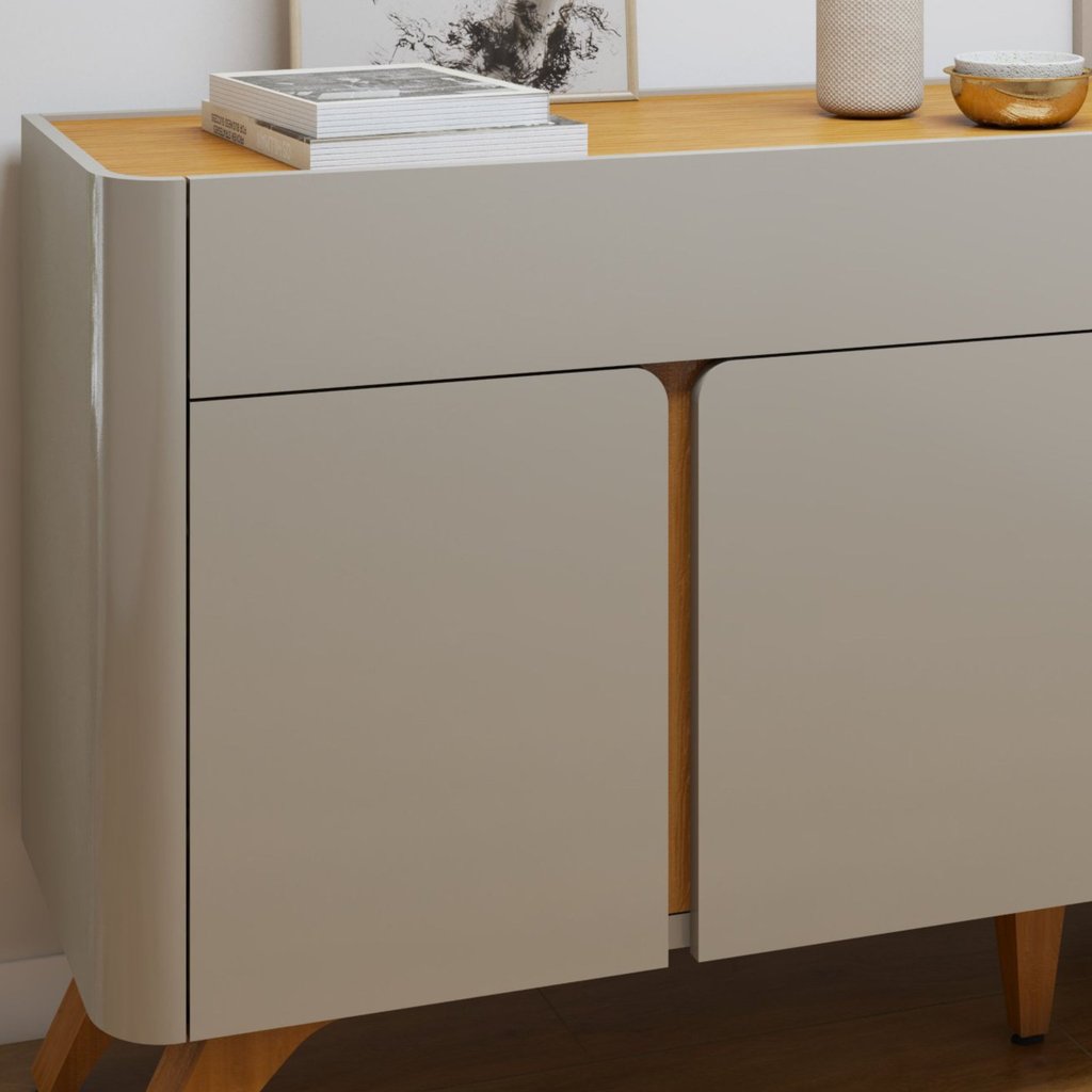 Buffet para Sala de Jantar Laqueado 100% MDF 4 Portas 172cm Pés em Madeira Maciça Aros Off White/Naturalle