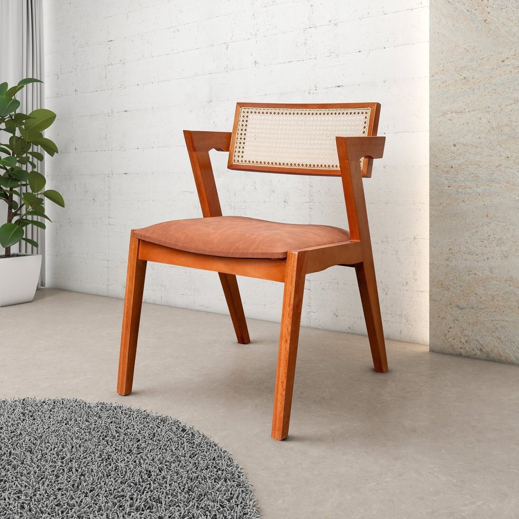 Kit 4 Cadeiras Madeira Maciça, Rattan de Fibra 100% Natural e Estofada Verona Espresso Móveis Champagne/Couro Marrom