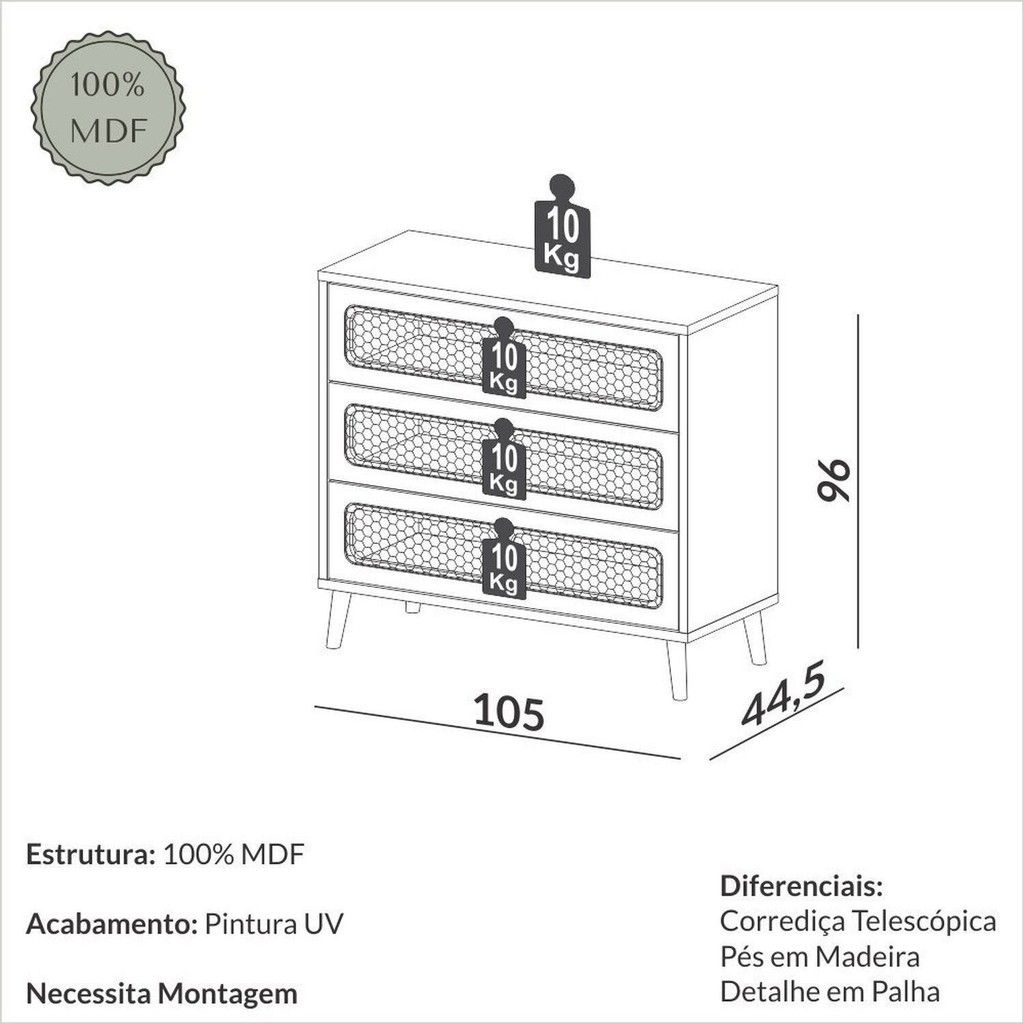 Cômoda para Quarto 3 Gavetas MDF TW56