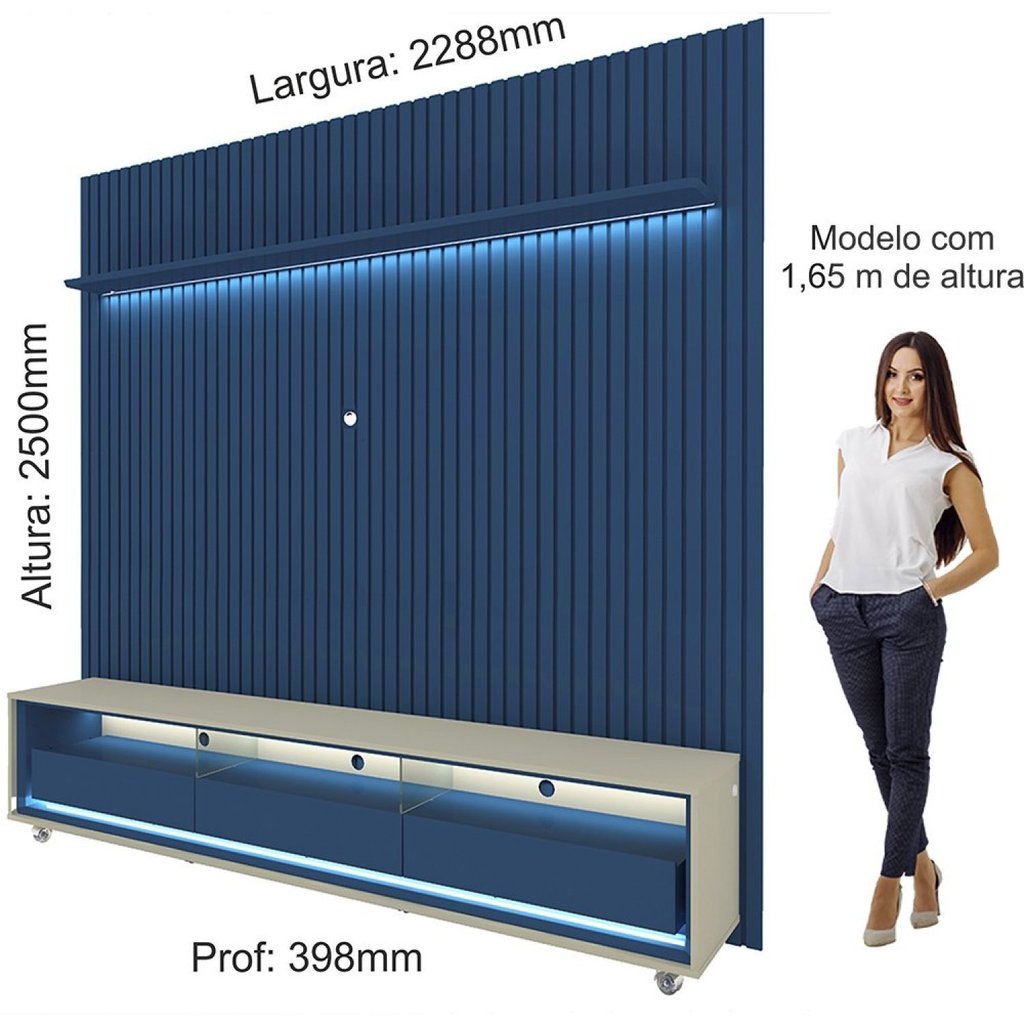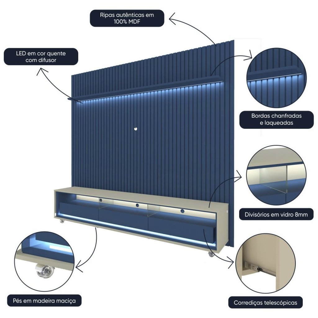 Rack com Painel Ripado para Tv até 90 Polegadas Led 3 Gavetas com Rodízios 230cm Naturale 100% MDF Azul Royal/Off