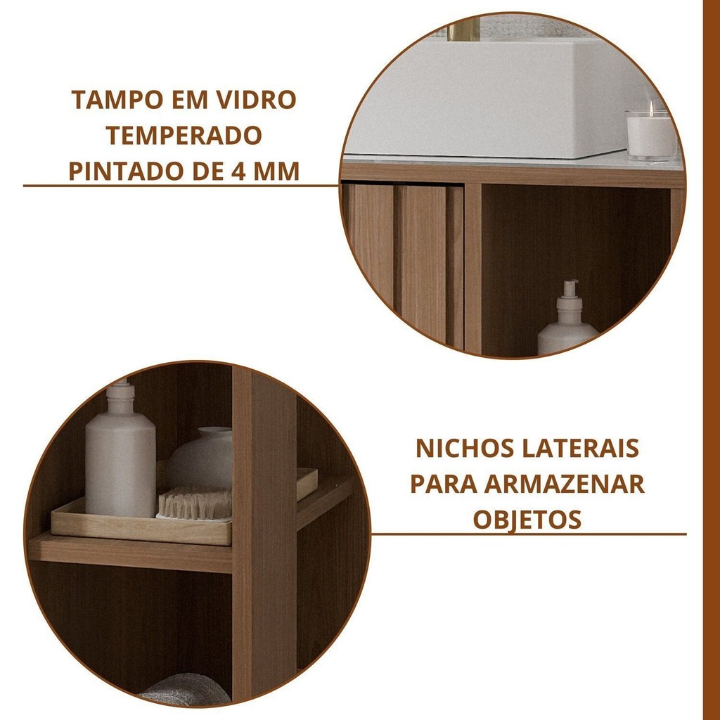 Gabinete para Banheiro 80cm com 2 Portas 2 Nichos e Cuba de Sobrepor Noruega Freijó