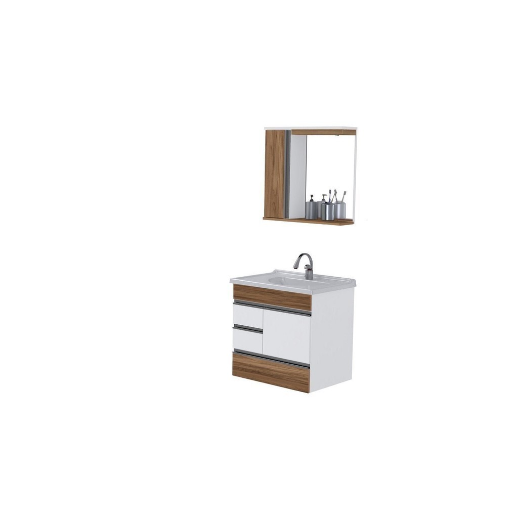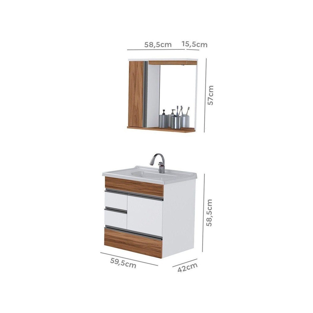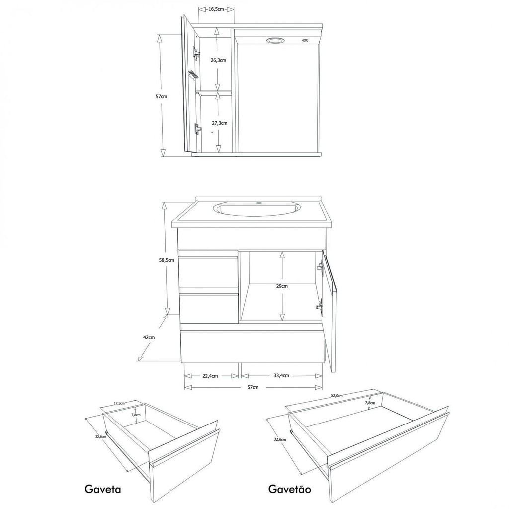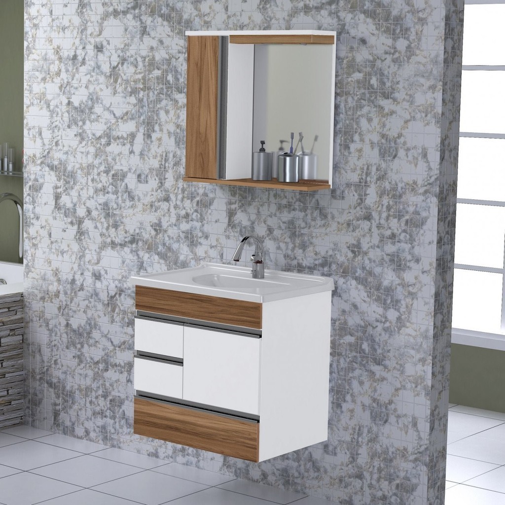 Conjunto Gabinete de Banheiro Suspenso 2 Gavetas e 1 Gavetão com Espelheira e Cuba