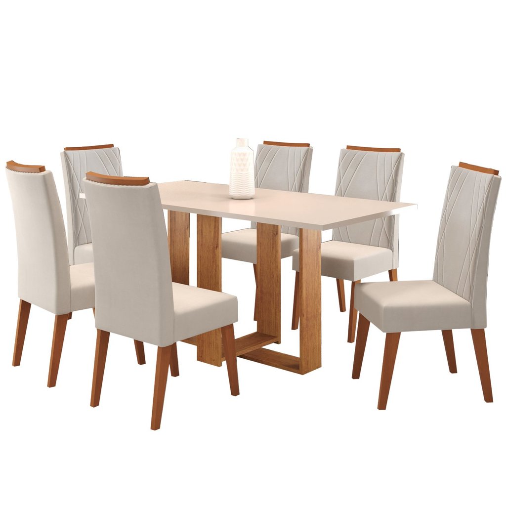 Mesa de Jantar Retangular Kavic com 6 Cadeiras Madeira Maciça Vegas Marfim/Mel