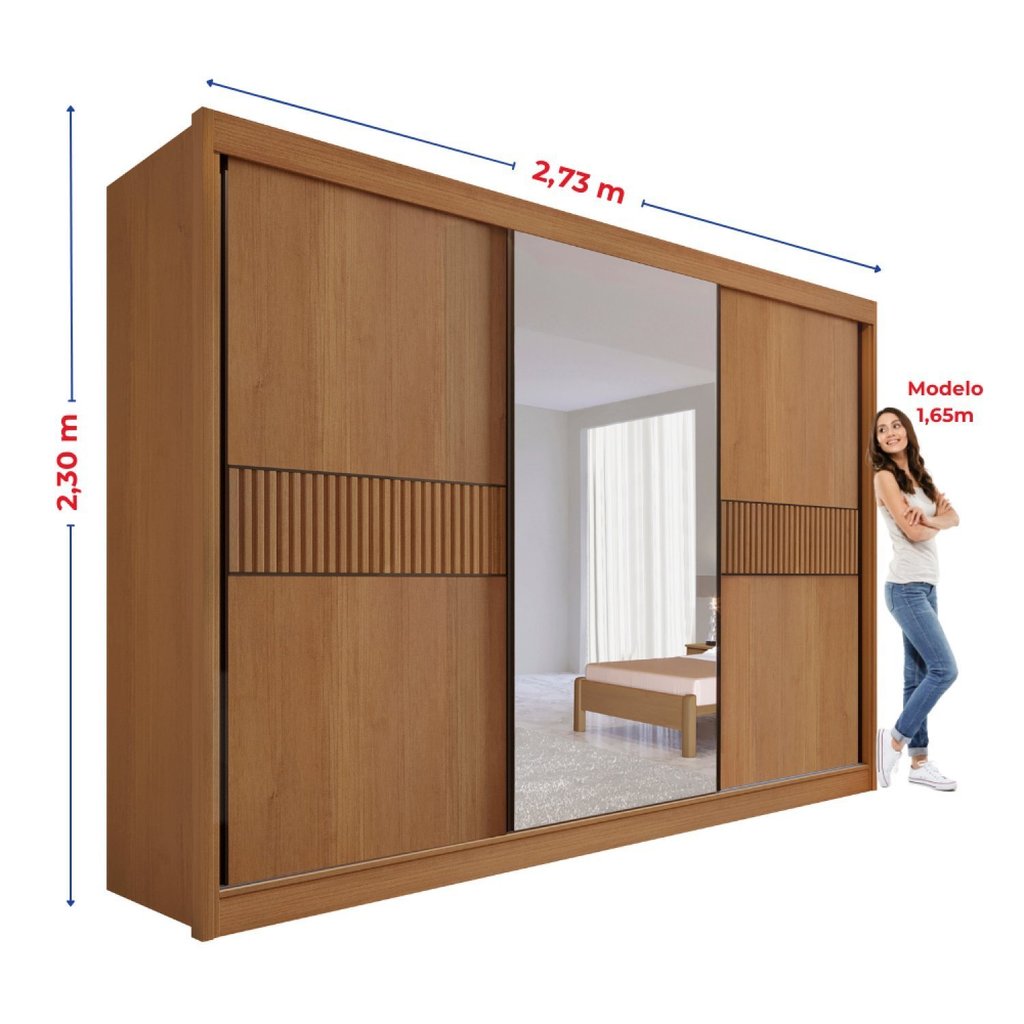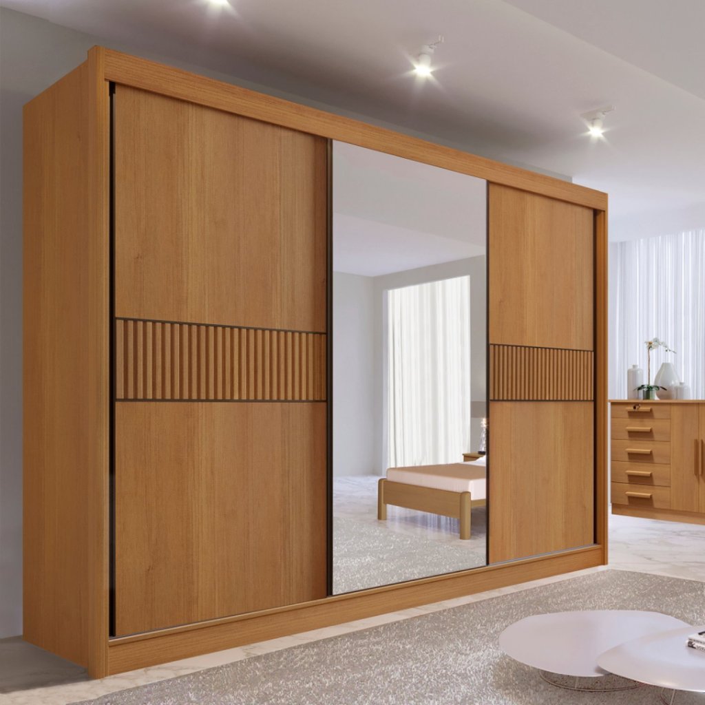 Guarda-roupa Casal Mdf com Espelho 3 Portas 6 Gavetas Miami Ripado Cinamomo/Off White