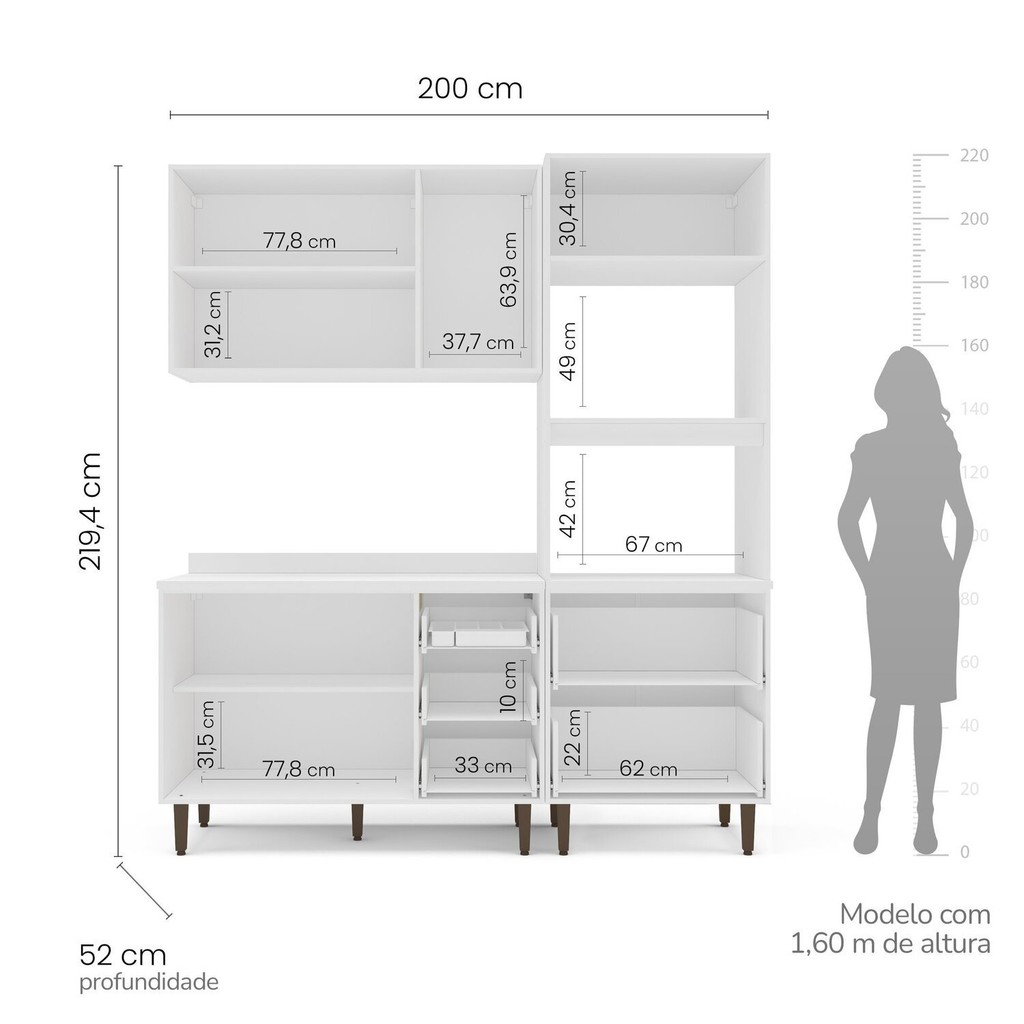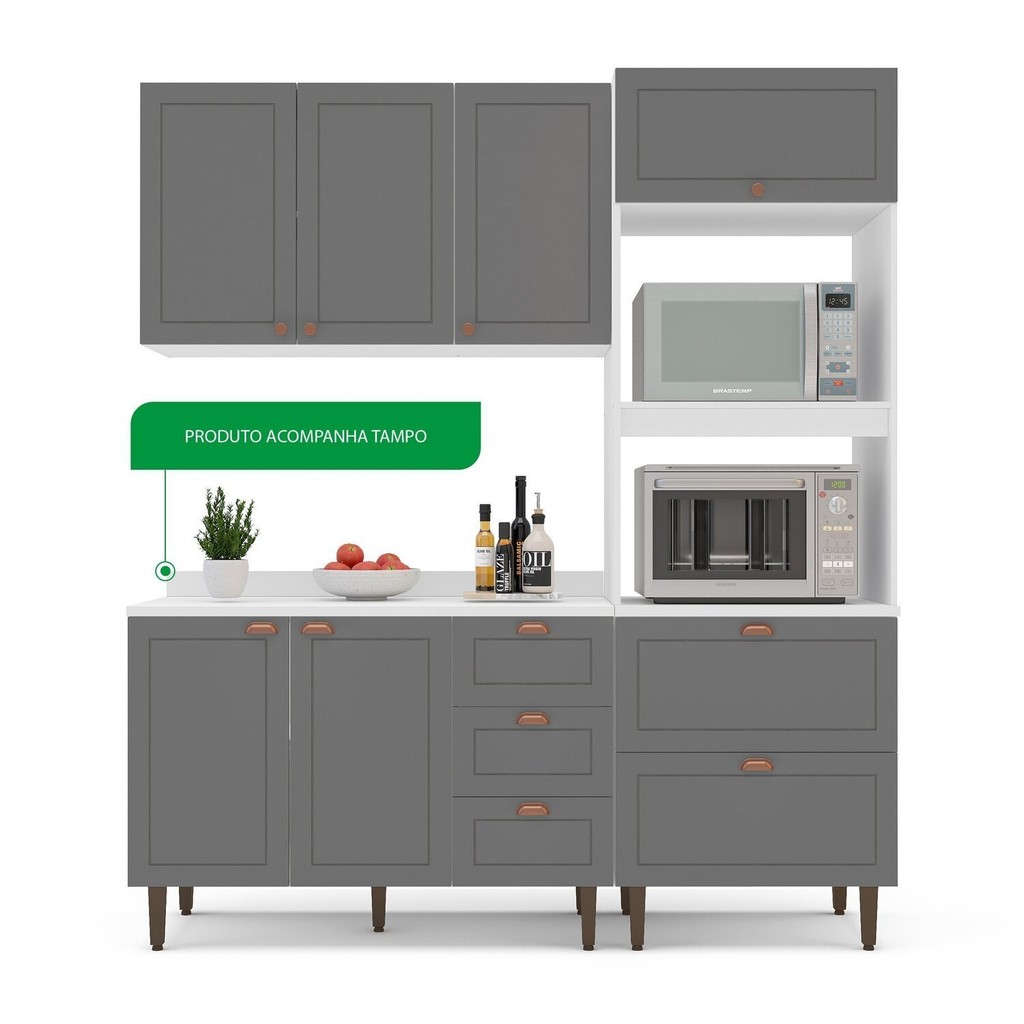 Cozinha Pérola com Tampo Completa 3 Peças Aéreo 3 Portas e Balcão 2 Gavetas 3 Portas e Torre Quente Cinza