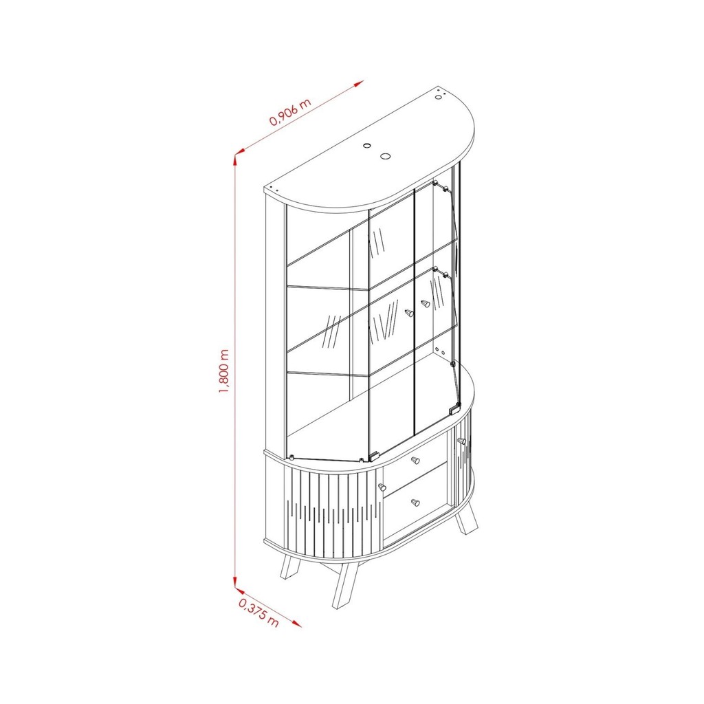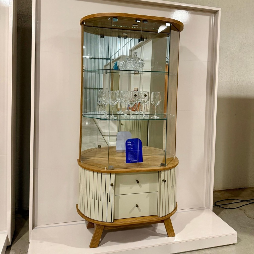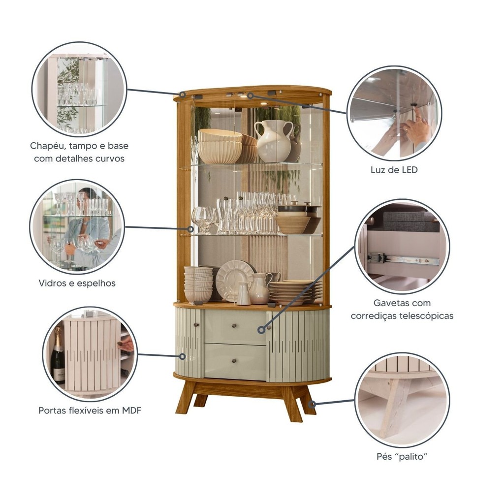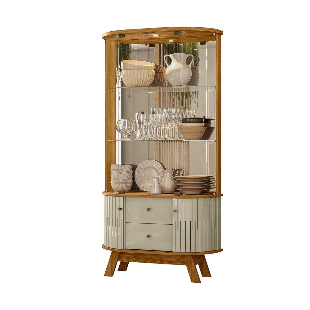 Cristaleira para Sala de Jantar 4 Portas Vidro Curvo com Espelho Led 2 Gavetas Moss Cumaru/Opala