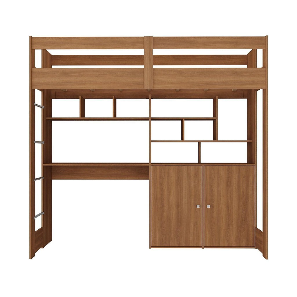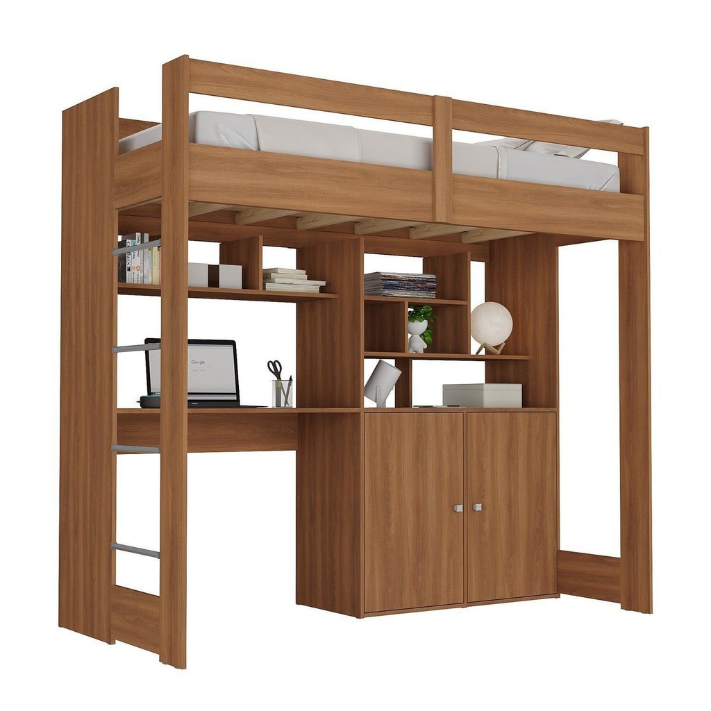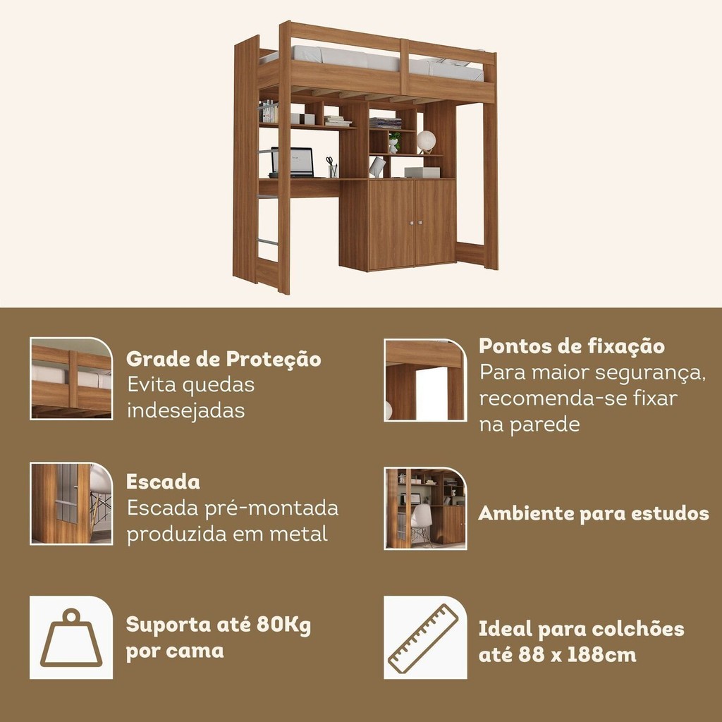 Cama Alta Infantil Juvenil 2 Portas com Escrivaninha Multifuncional Zwork Yescasa Nogal