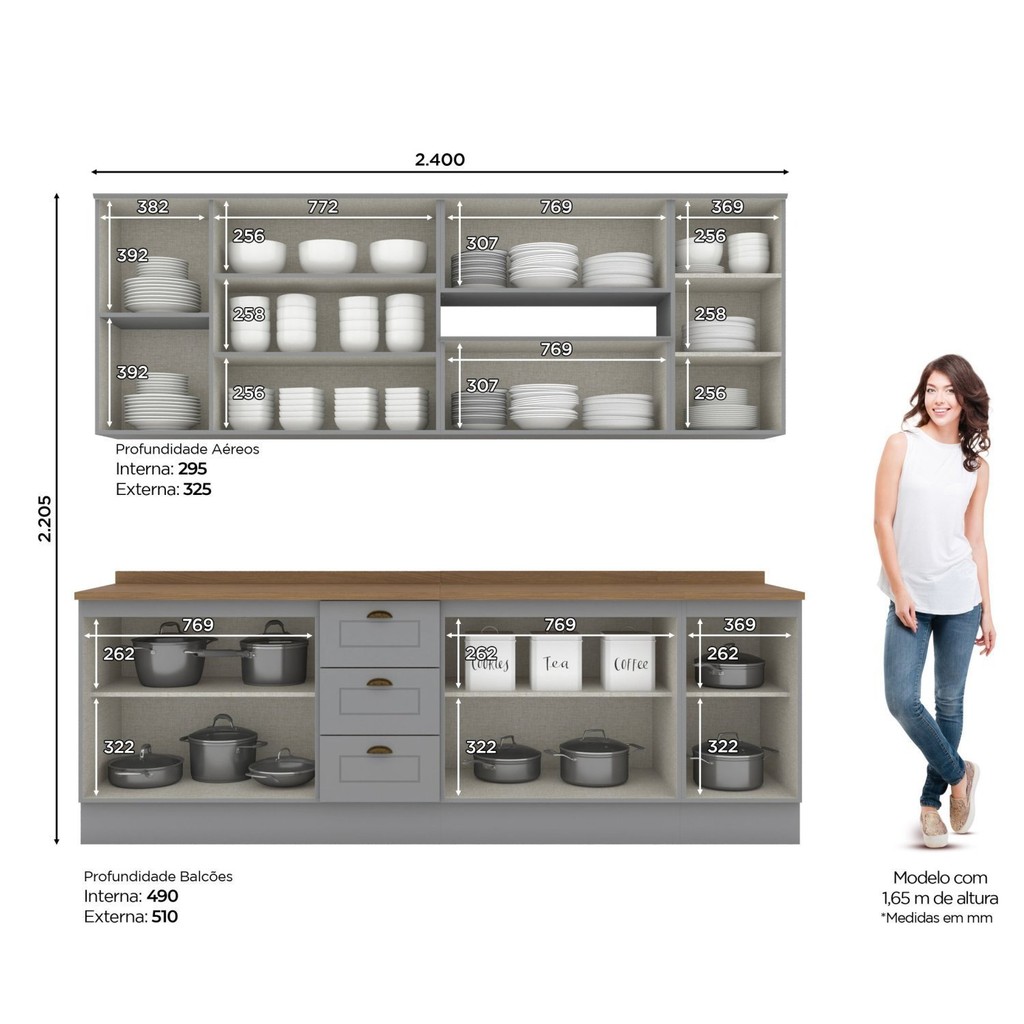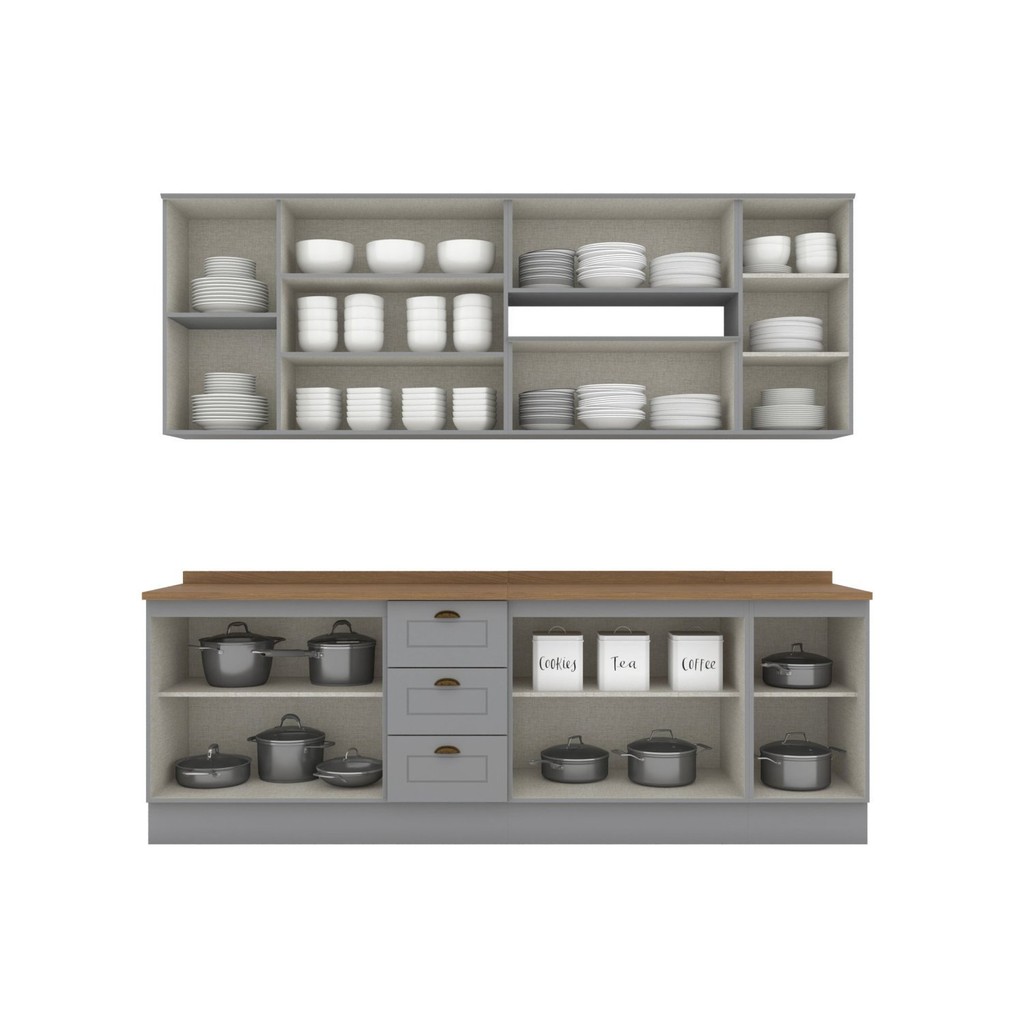 Cozinha Compacta 7 Peças 11 Portas 3 Gavetas Emily Cinza/Nature