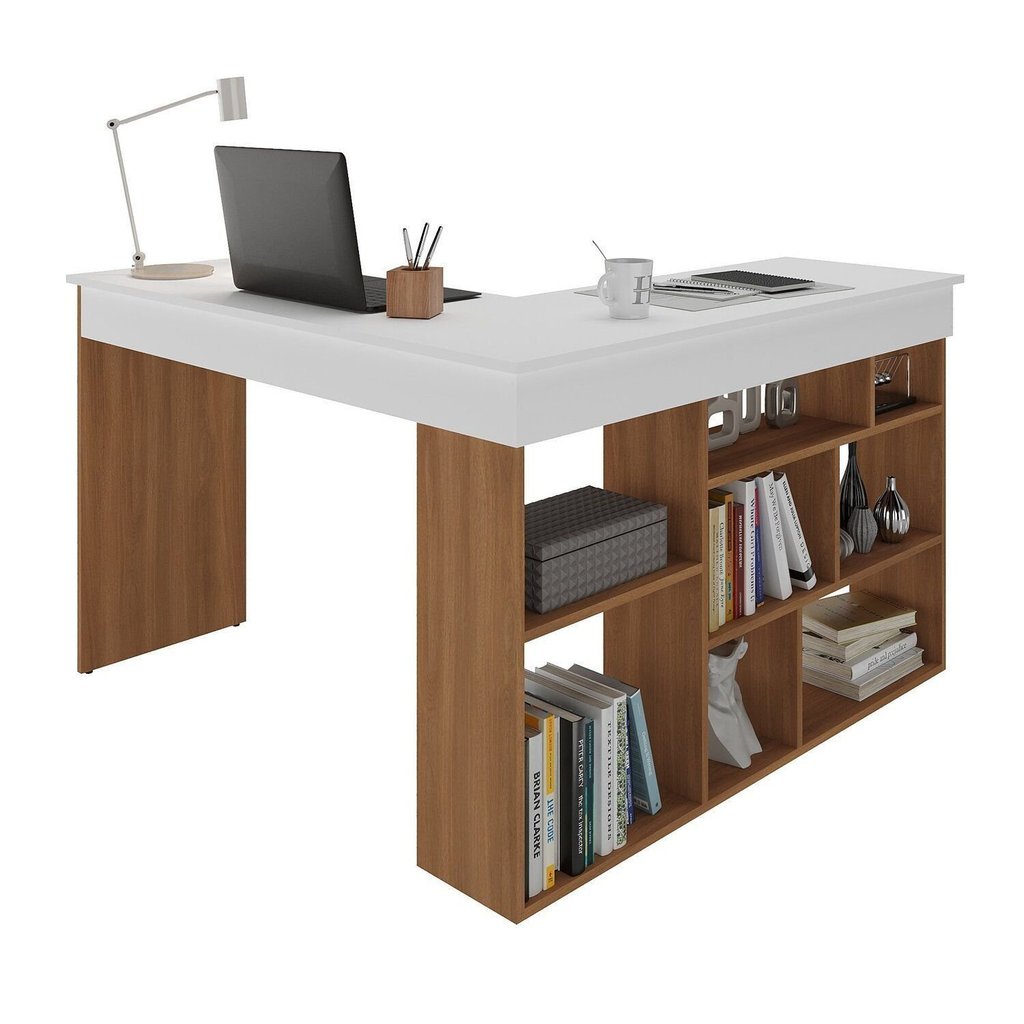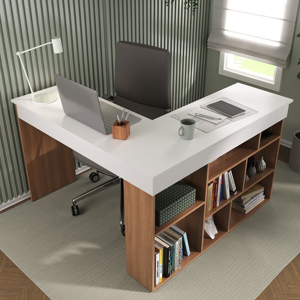 Escrivaninha Mesa Escritório em L 8 Nichos Montecello Yescasa Nogal/Branco