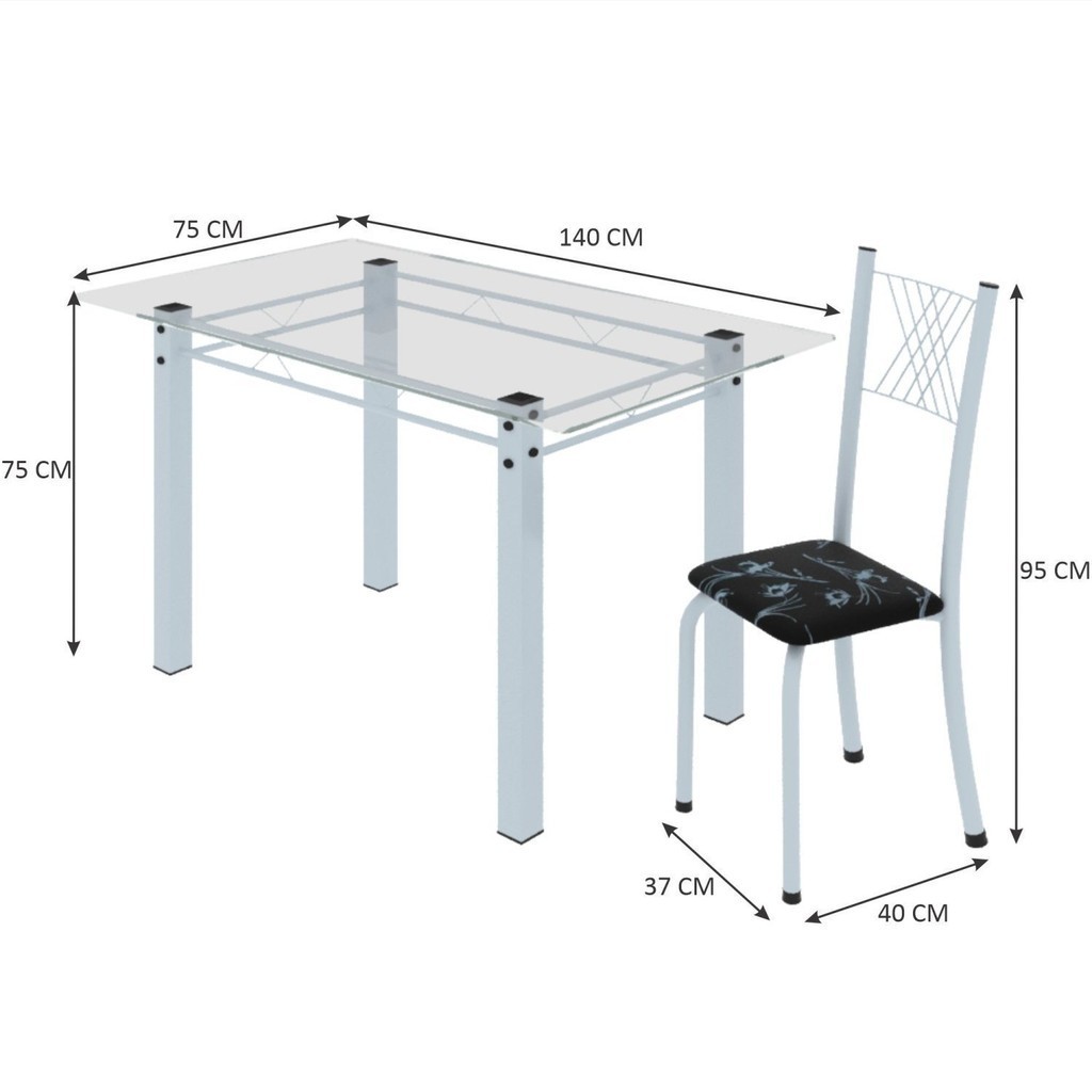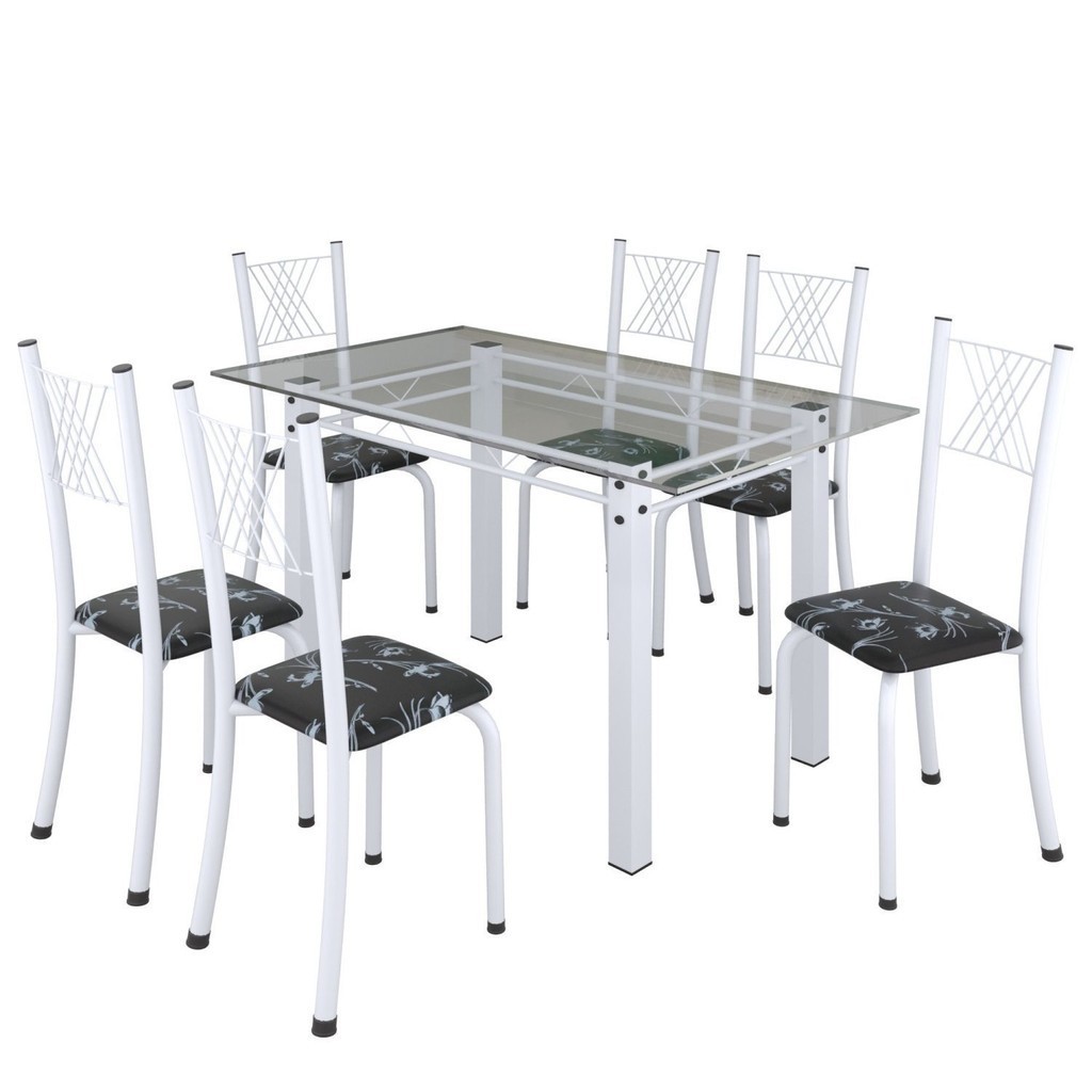 Conjunto de Jantar Mesa 140x75cm Tampo de Vidro Incolor com 6 Cadeiras Sara Yescasa Branco/Preto Floral